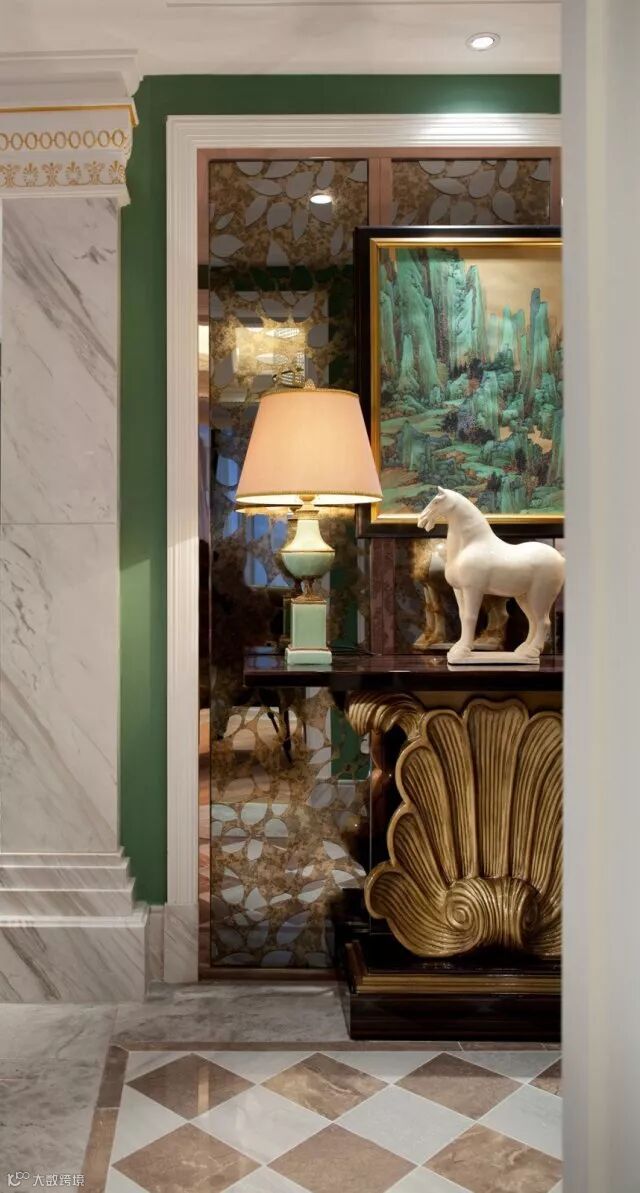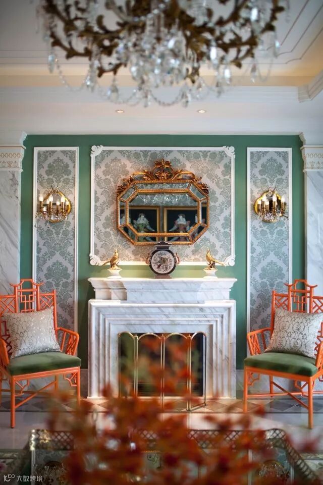 客厅中央曼妙的灯光、绿色的窗帘,空间亮丽的橘色与绿色点缀,处处点精,展露出浪漫安逸的新贵族生活。
