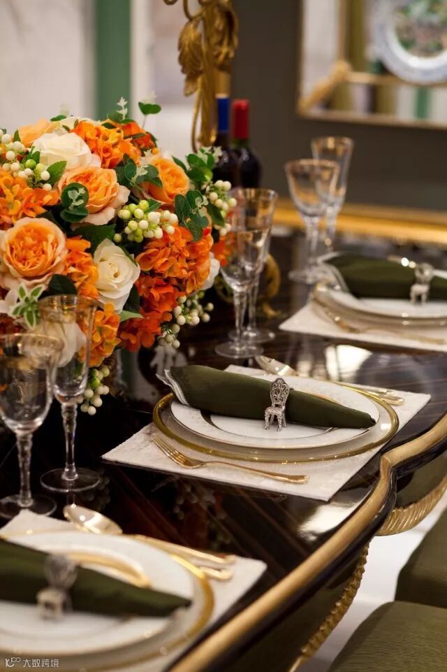 餐厅空间精美的餐具、橘色与绿色通过晶莹的水晶杯,透出一幕诱人的私人盛宴。