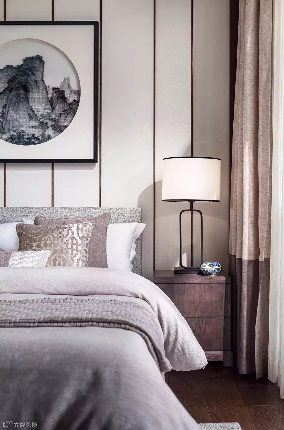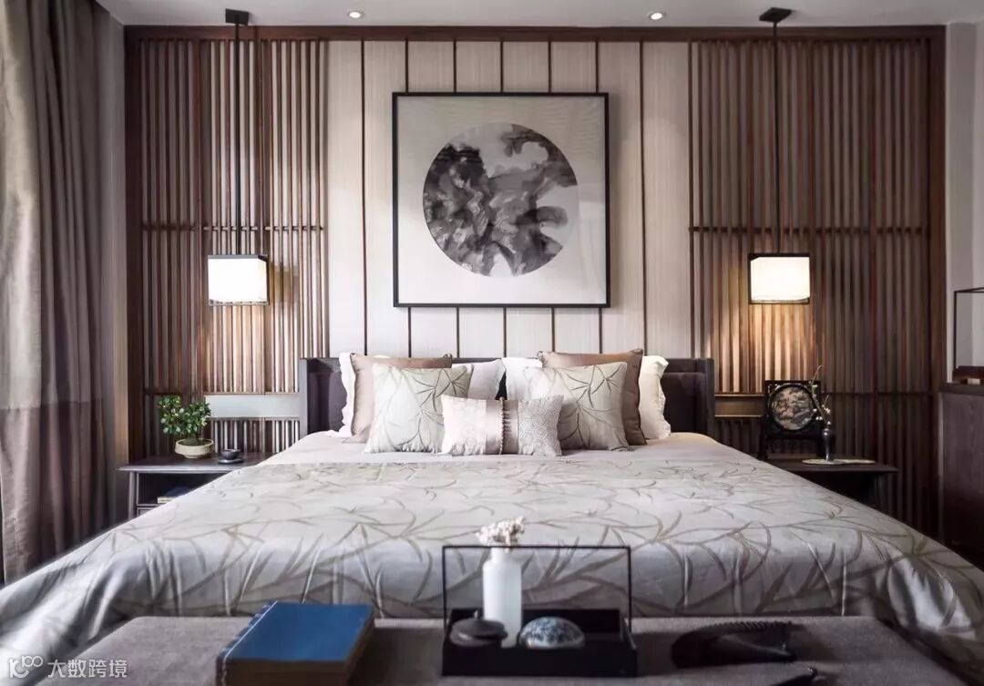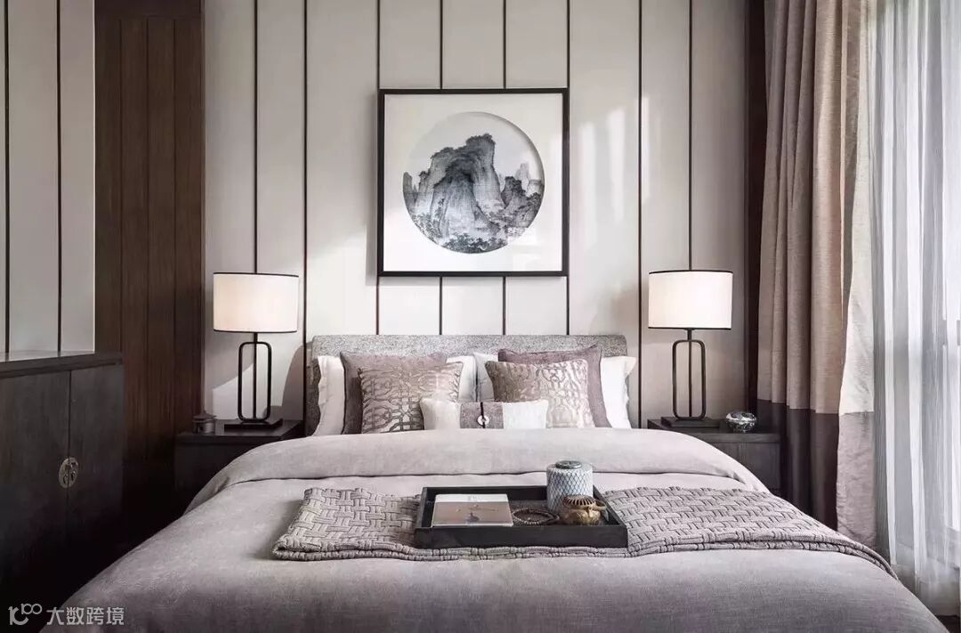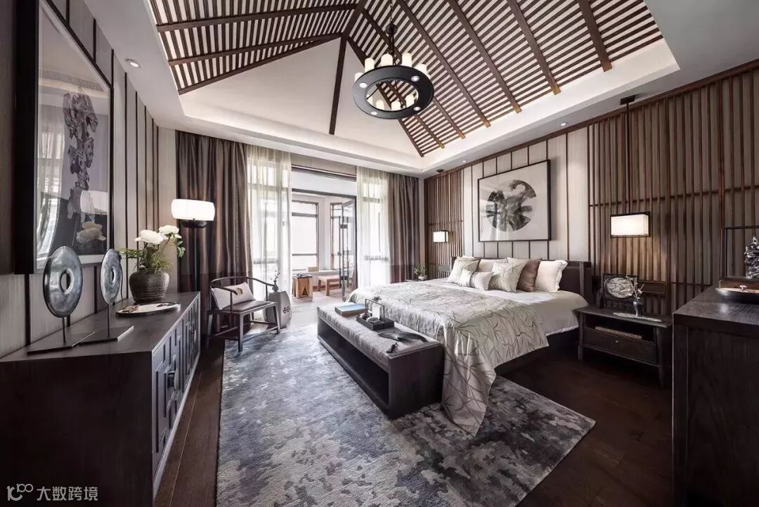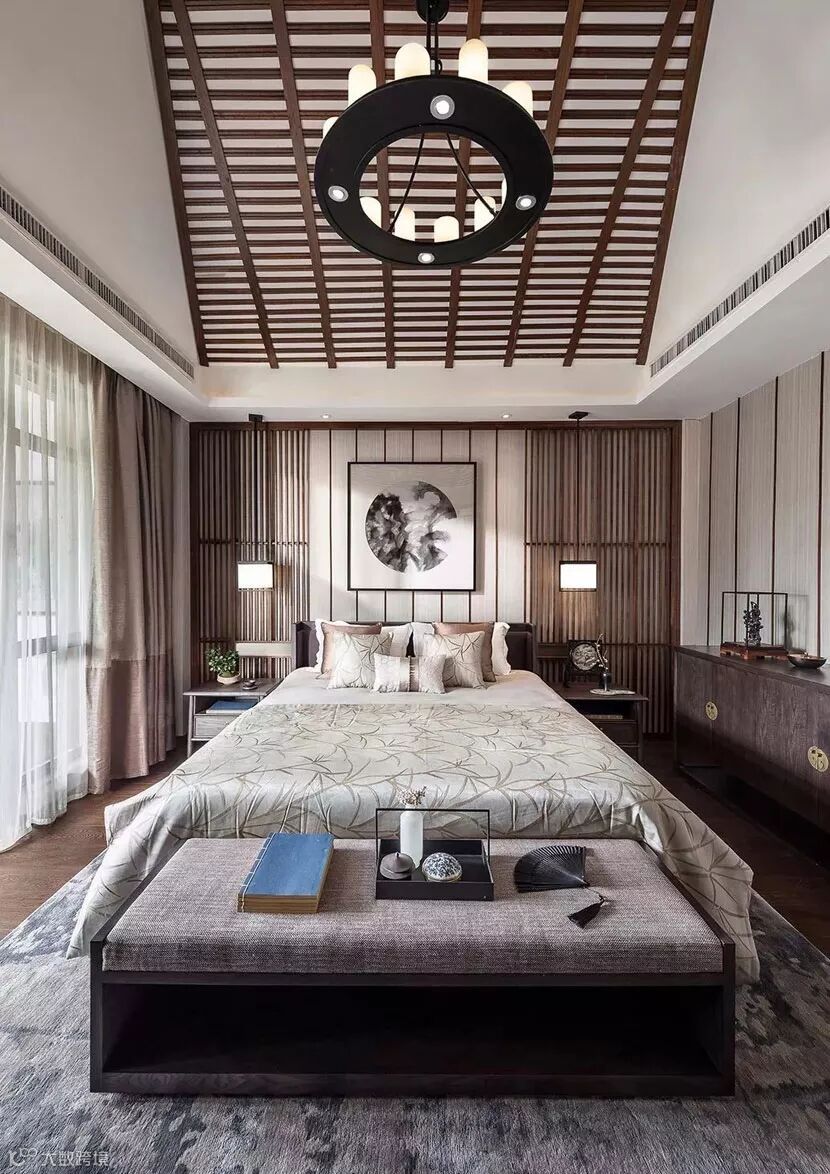天花设计采用木架斜屋顶造型,大气而稳重;木质温润的触感、淡雅素净的配色及艺术品的点缀为主卧进行了全新的定位。