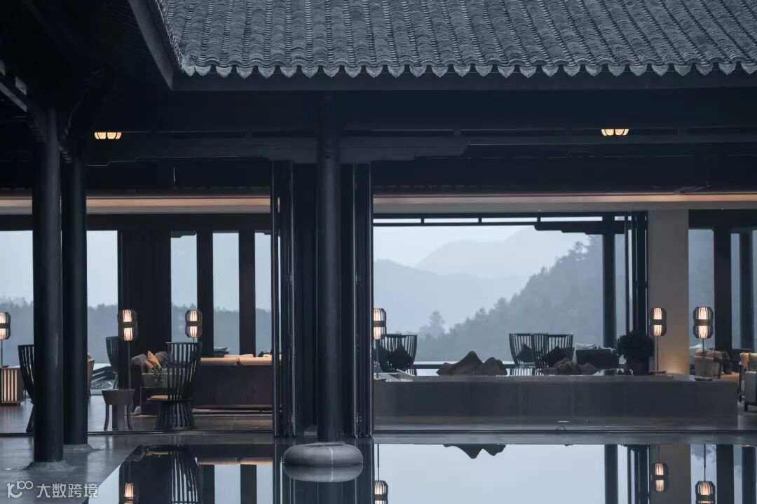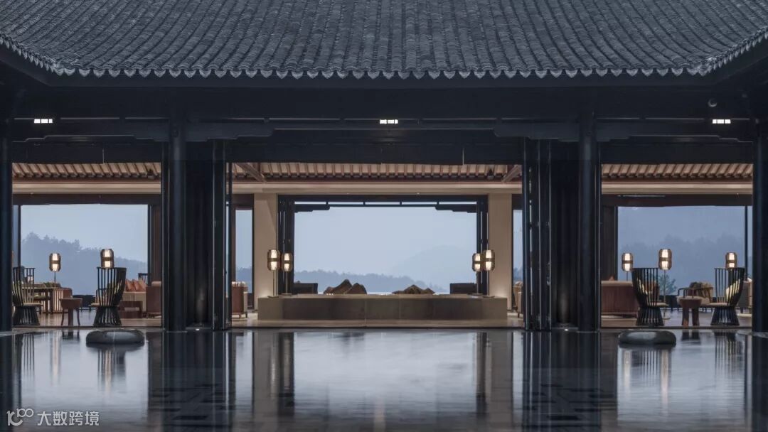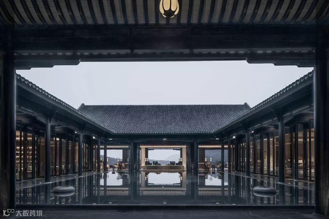 大堂区域是一个方正的四合院,到达感的营造通过一条山水轴线铺陈开来,从主入口经水院至大堂吧的镜面水台,与户外平台的反射水池衔接,视线最终停歇于远处悠扬连绵的山岭与水库,客人的心情在瞬间即会变得安静与开阔。