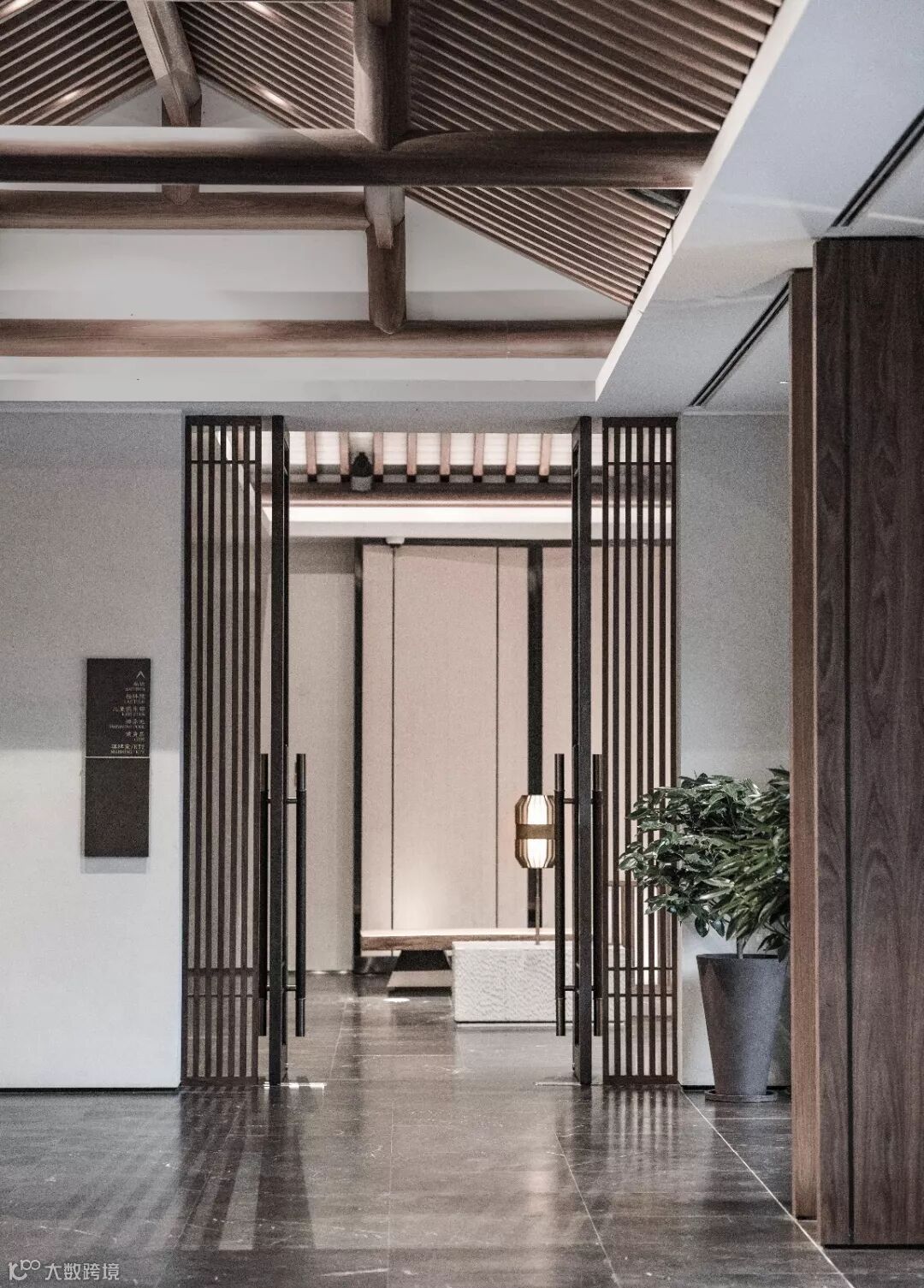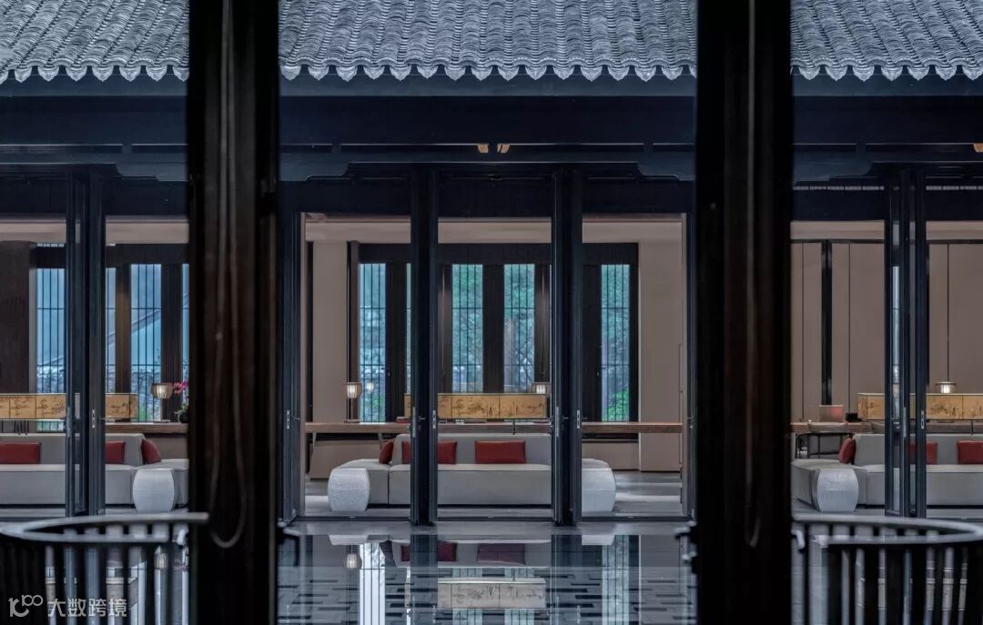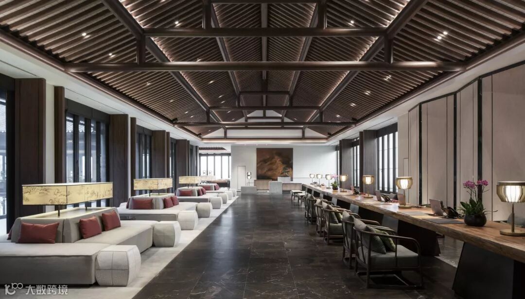 围绕中庭的水院,接待大堂、大堂吧、尚书吧依次分布,一系列无柱举架空间,有别于传统中式木构梁柱体系给空间带来的分隔感,室内设计意图以整体化的语言将这三个空间串联起来.