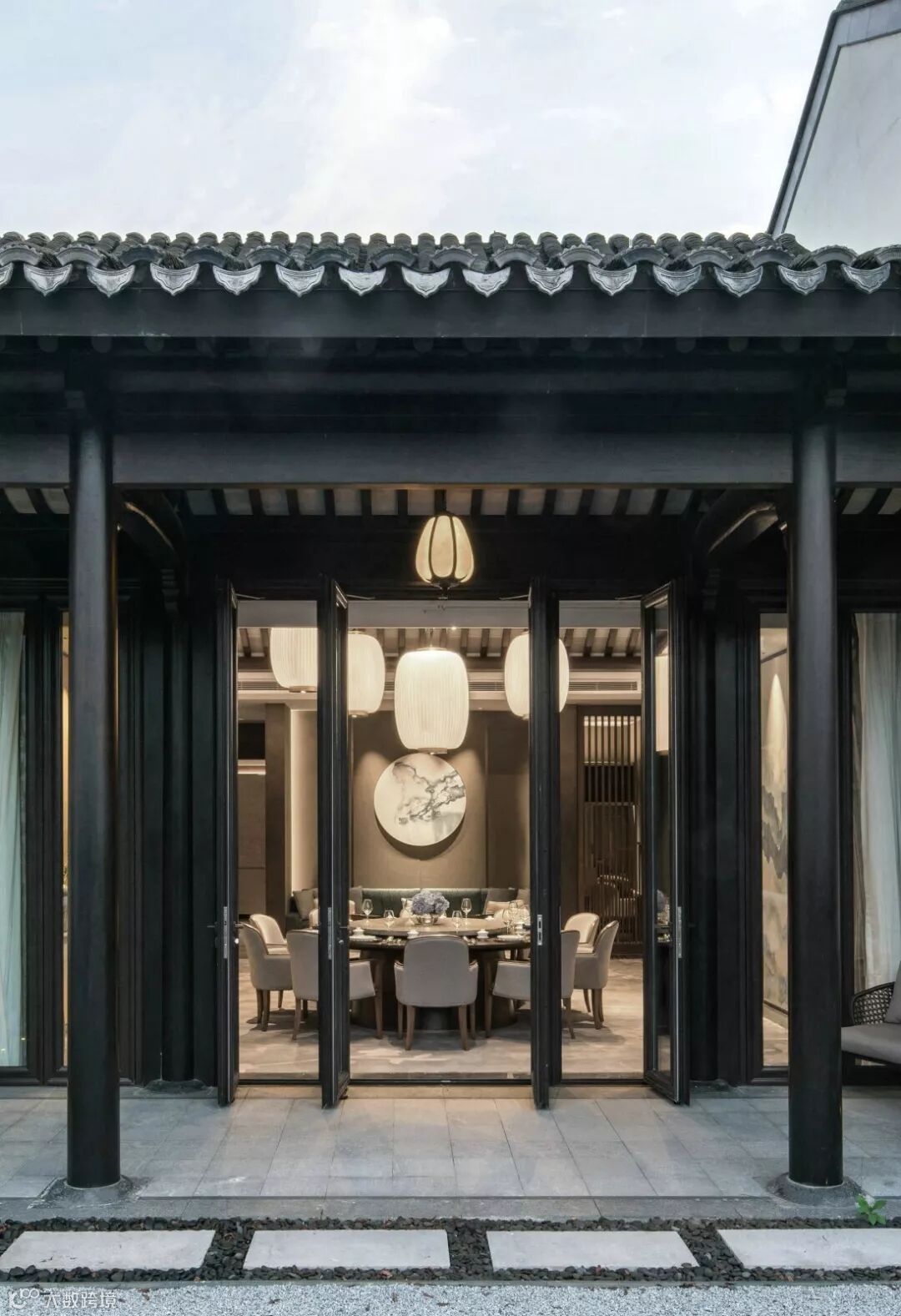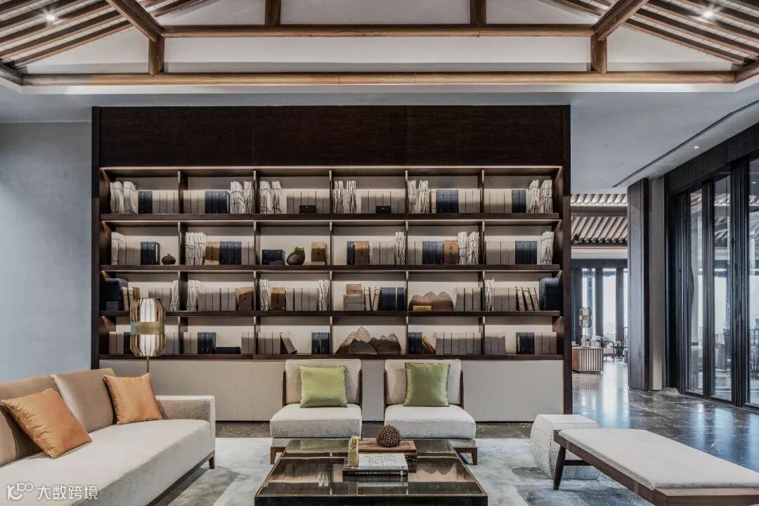 位于中心的厚实感水景映照出室外景致,引景入室,附随水景两旁设有现代中式休闲沙发组,简约线条游走于中式建筑之间,在此日间可品茗赏山水,夜晚则对影邀清风明月。