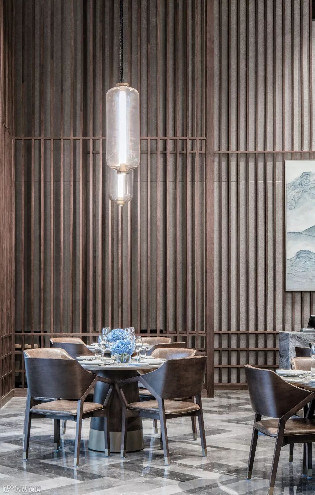 组合式艺术家具、中式屏风、原木台面在此再次出现,与对面的大堂接待区呼应。