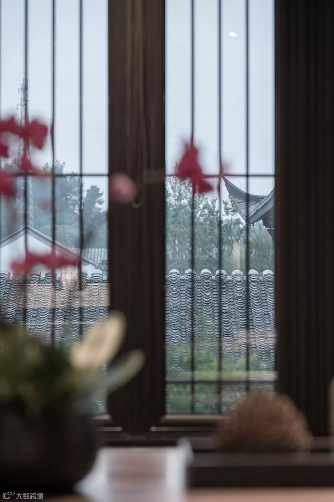 接待台的一侧墙面进行视线管理,以连续屏风将近处不理想的景观屏蔽,顺势成为接待前台的稳定背景,而将远处的山景与近处的古典建筑翘角透过传统门窗与竹帘,与台面远端的等候阅览区域相映。