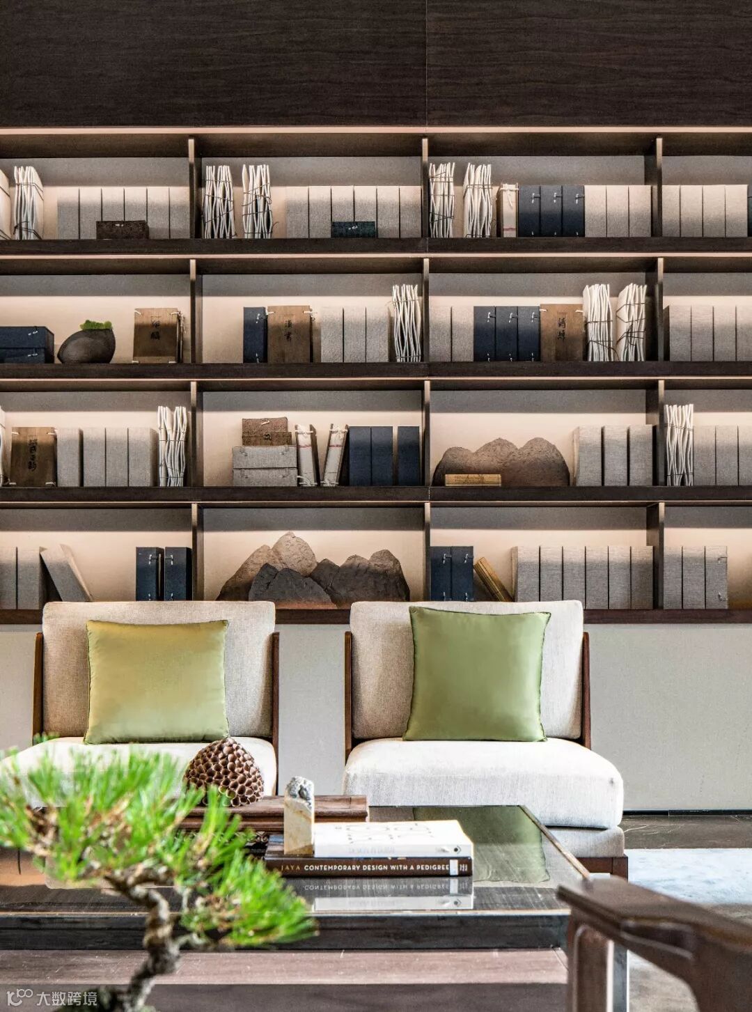 水院右侧的接待大堂沿纵向动线两侧是接近20米的原木台面及三组等待沙发,视线尽头是一组由石、木、铜组合而成的抽象艺术家具,材质与体量错落,暗喻掩映的山岭意境。
