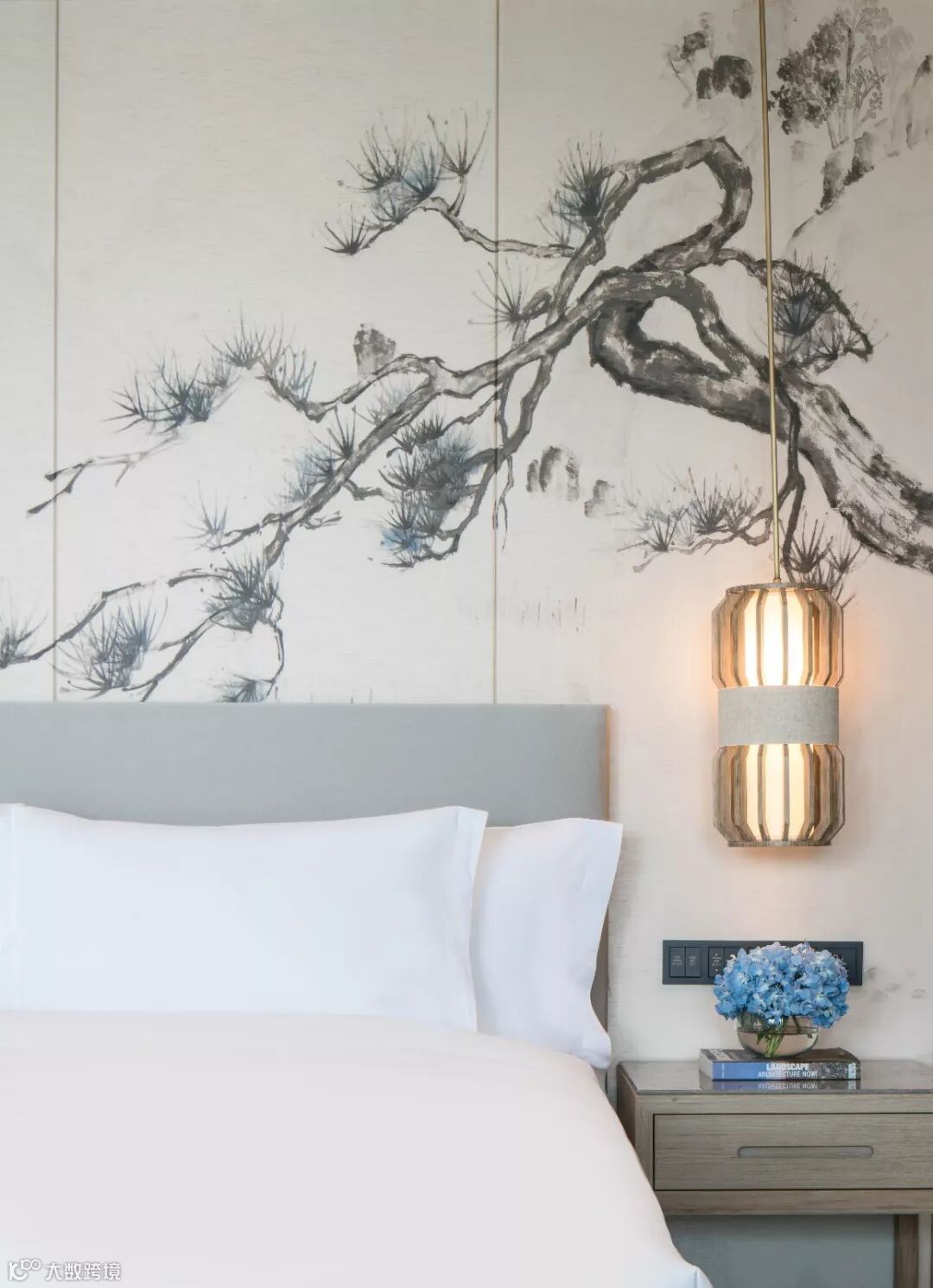 室内设计另辟蹊径,并未沿袭安吉其他酒店强调“竹”的手法,而是以反映中国文人品味 “松、竹、梅”为主题,将色彩与图案应用到地毯、门牌、背景、艺术品之中,分层布置,给宾客不同的感官与心灵体验。