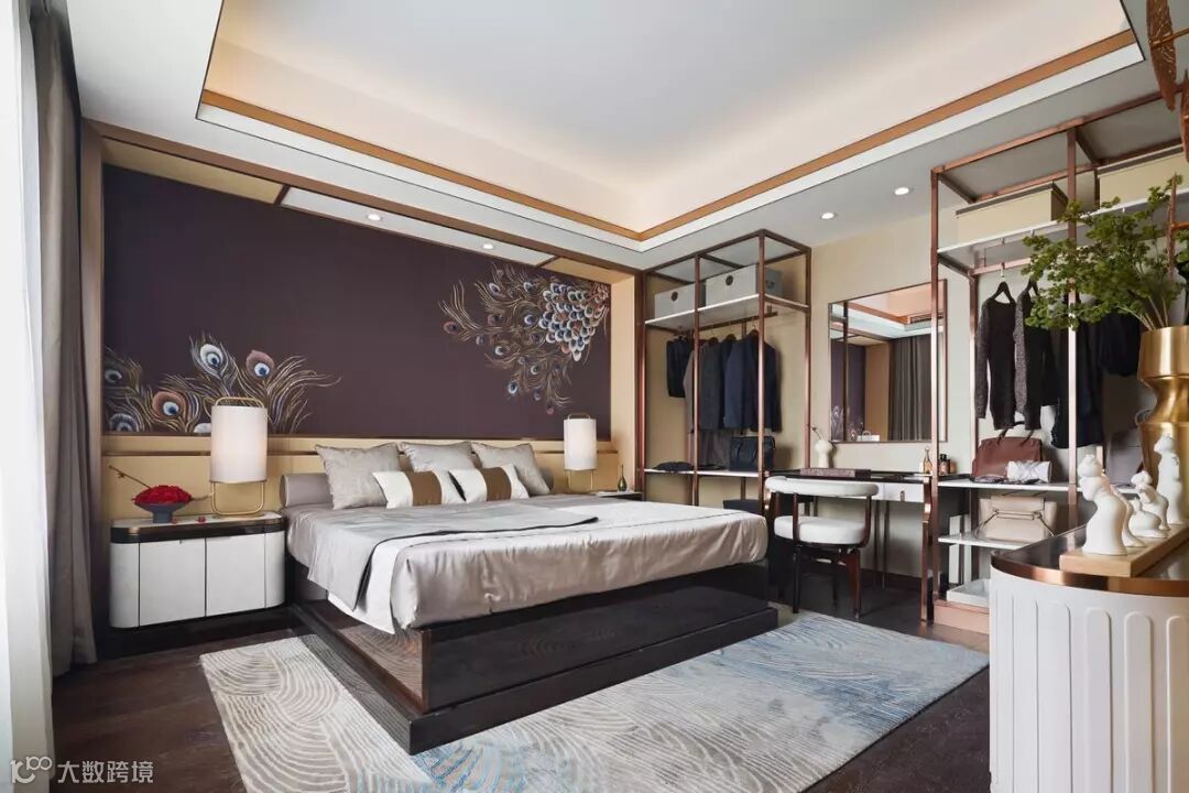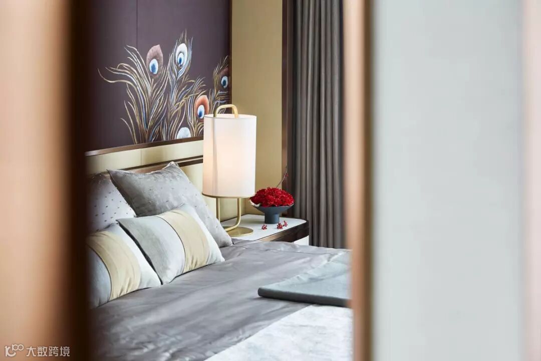 在主人房的床背处,设计师植入刺绣的羽毛图案,一束束晕黄的灯光洒落在羽毛上,金光闪耀的丝线给房间增添了富丽华贵的印象。