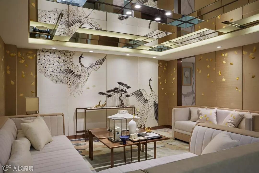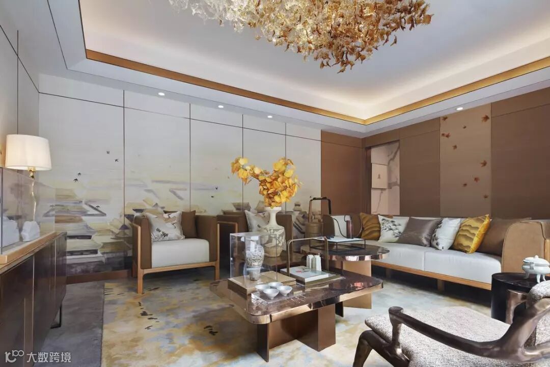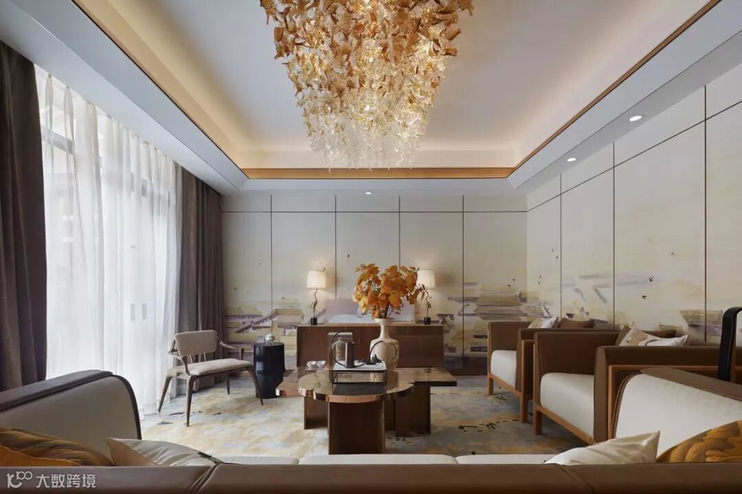 客厅,整体空间以华丽的漆金色为主色调。高悬而上的吊灯以秋季金黄的梧桐叶为原型,栩栩如生地传达着独属于上海的中国。
