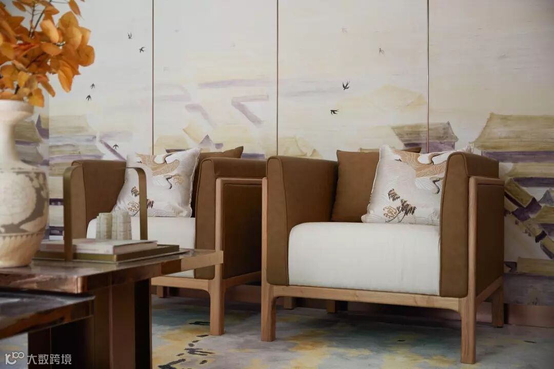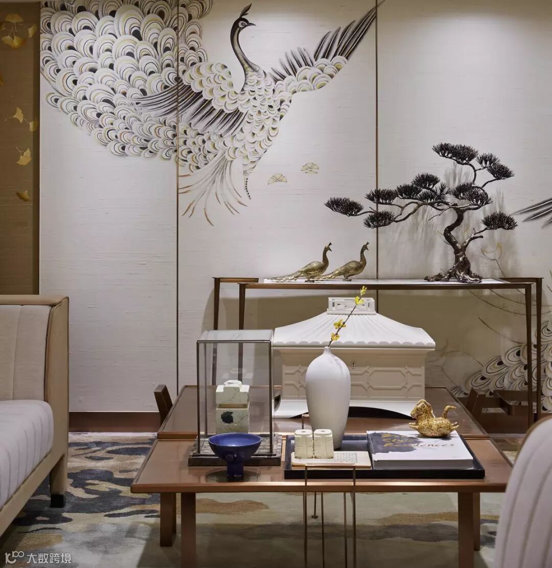 步入家庭厅,成双的仙鹤腾空而跃。背景墙取“仙鶴”之意,換為“凤凰”之形,融进传统工艺“顾绣”,让内容更加丰盈、耐人寻味。