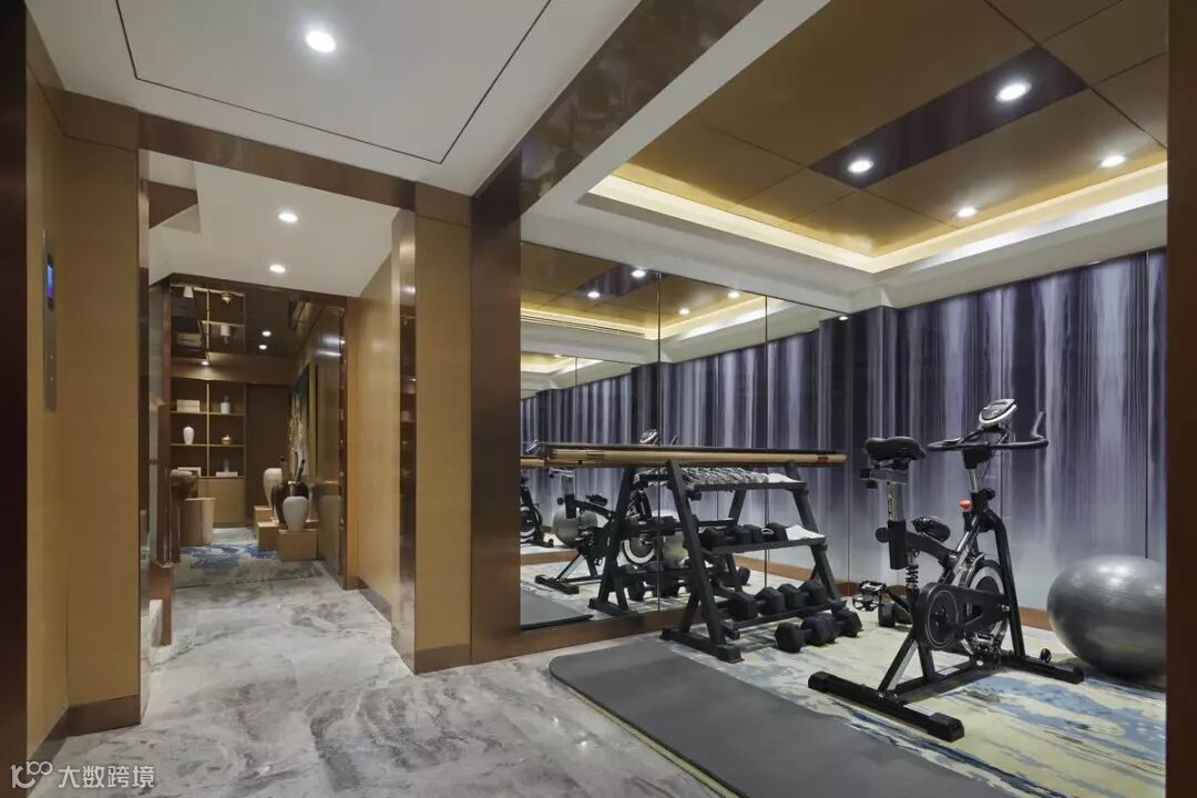 健身房,狭长通透的的空间萦绕着金属光泽的质感。一墙抽象画风的流水迸溅,气势恢宏,意境澎湃而悠远。