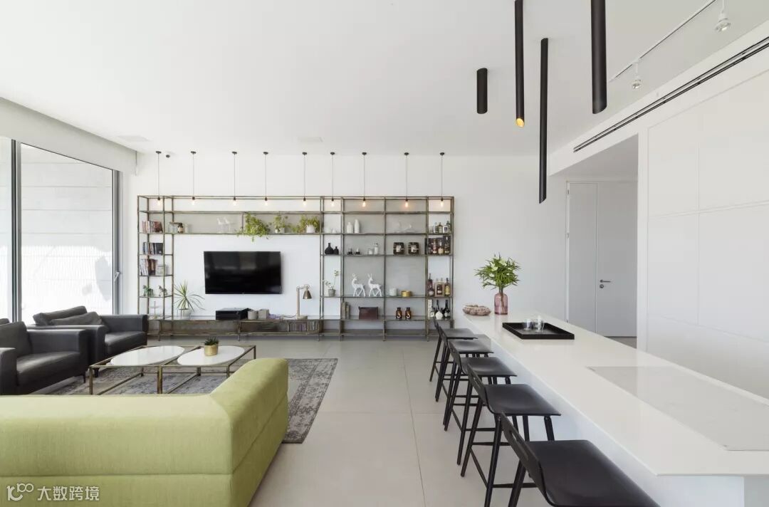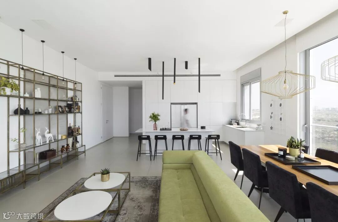 客厅的中心是一个娱乐中心,由黄铜色金属型材和铝网制成,给空间一种工业风格和平易近人的感觉。