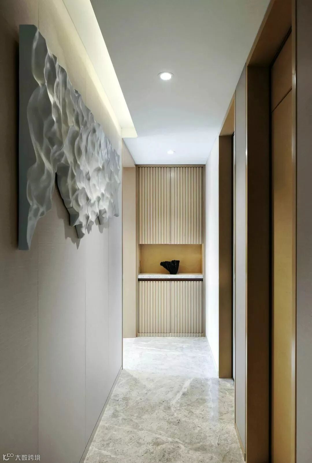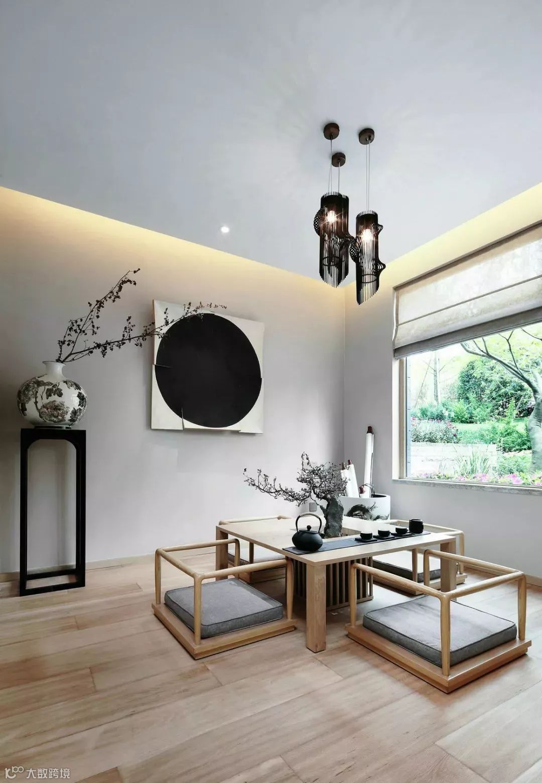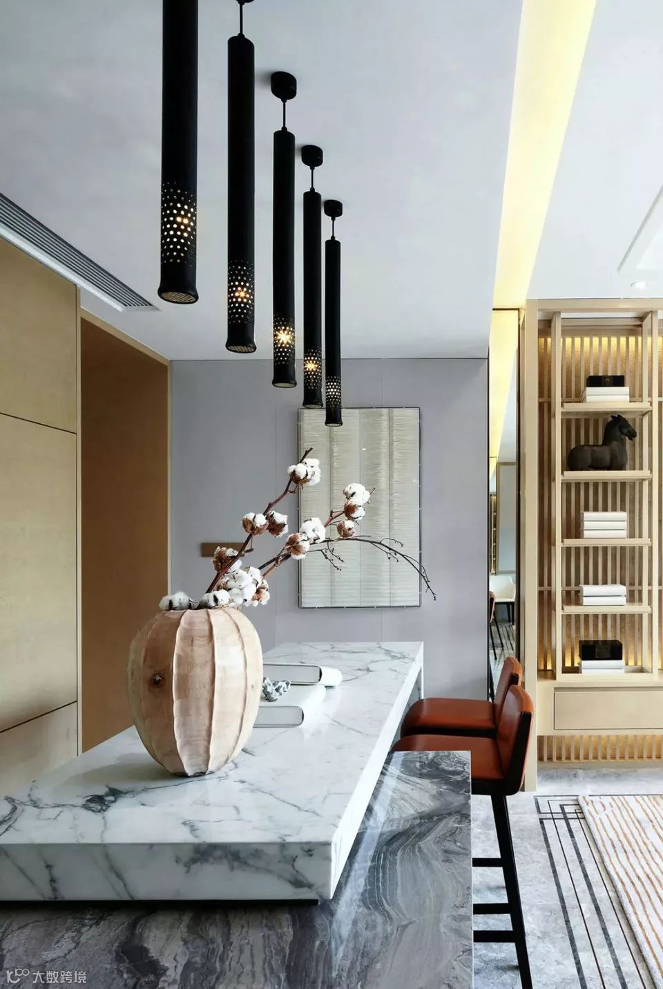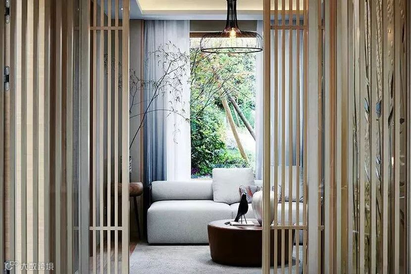 透过木质竖条构成的玄关隔断,影影绰绰中已领略到屋内景致,黑白灰的主色调配以原木为主的空间装饰,除却繁冗雕饰的禅意风骨由此呼之欲出。