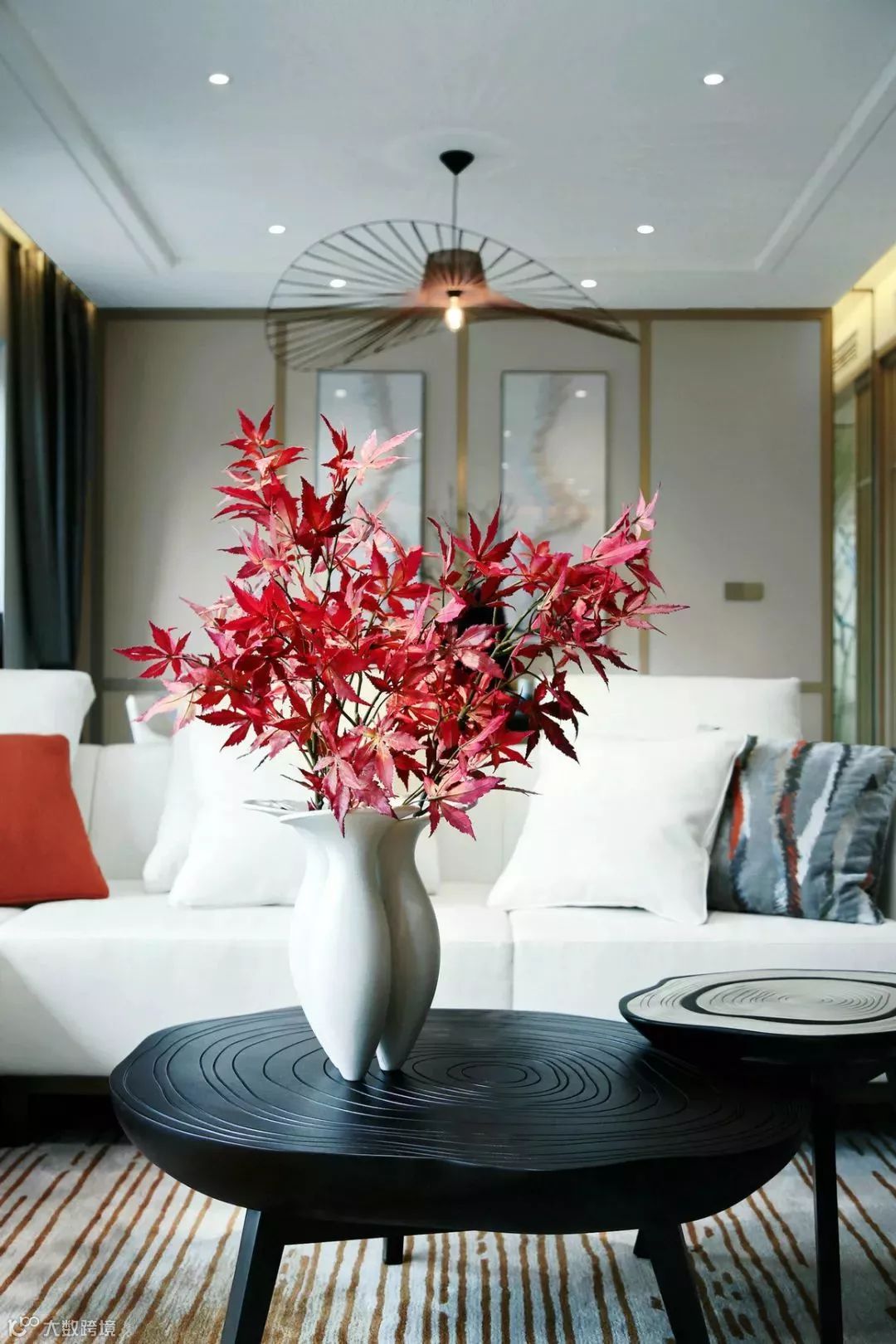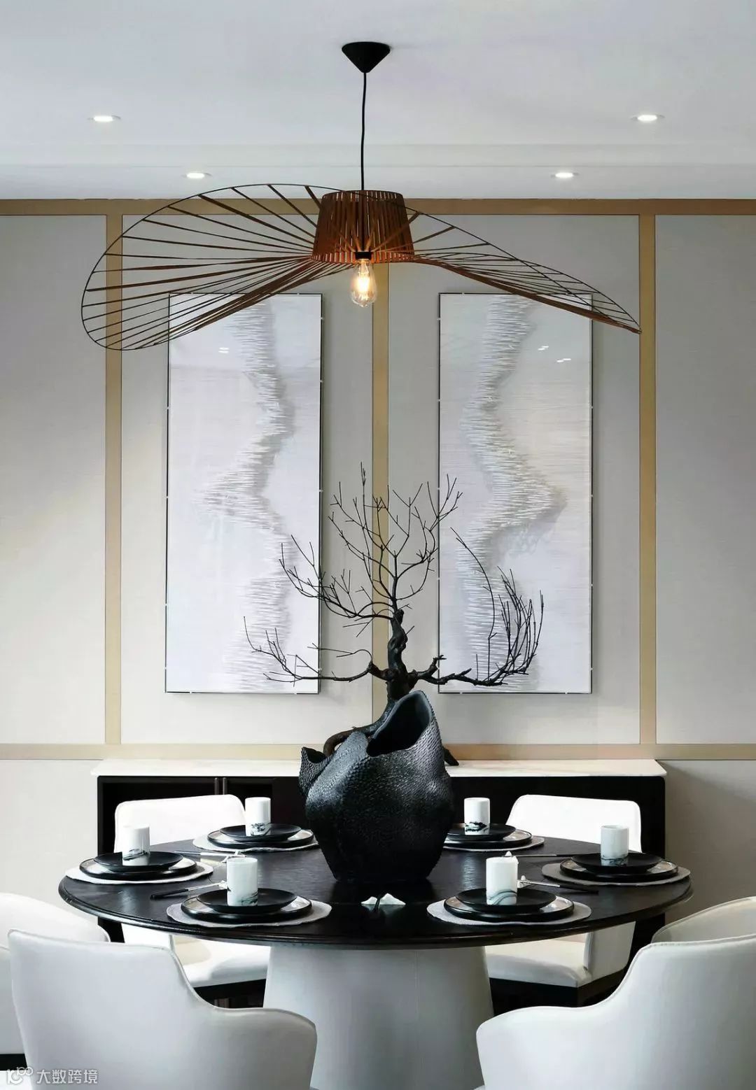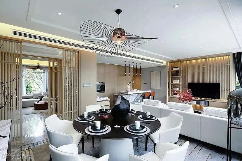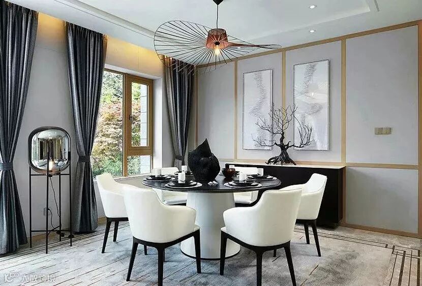 客厅与餐厅的吊灯姿态轻盈,曲线轮廓与平直硬朗的空间背景相得益彰,暗合天圆地方的禅定哲学。