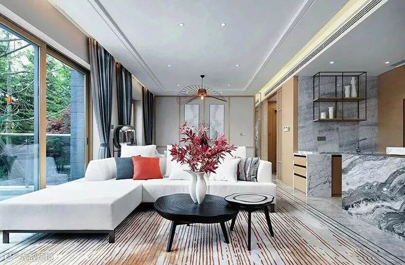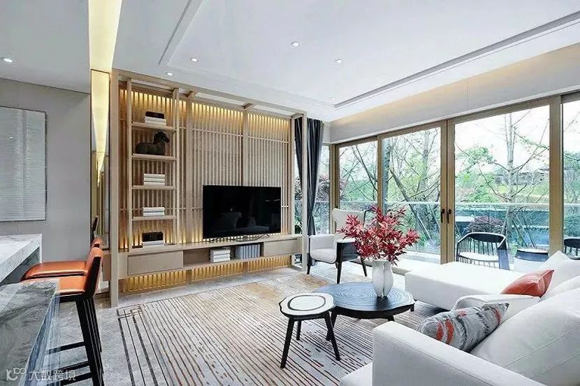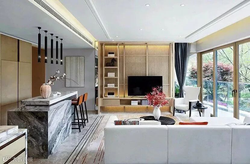 客厅空间,结构与比例拿捏严谨,借助利落线条及石材、木材的搭配运用,呈现视线交织的美感。