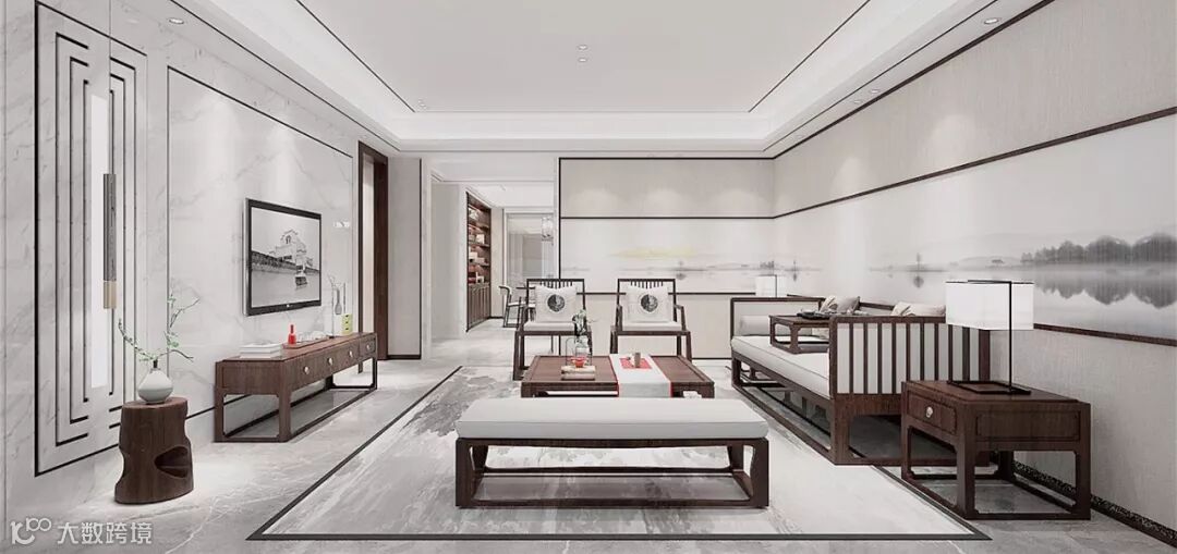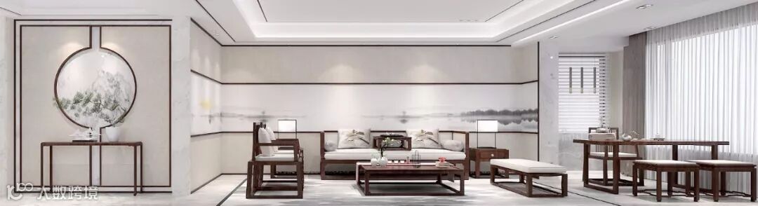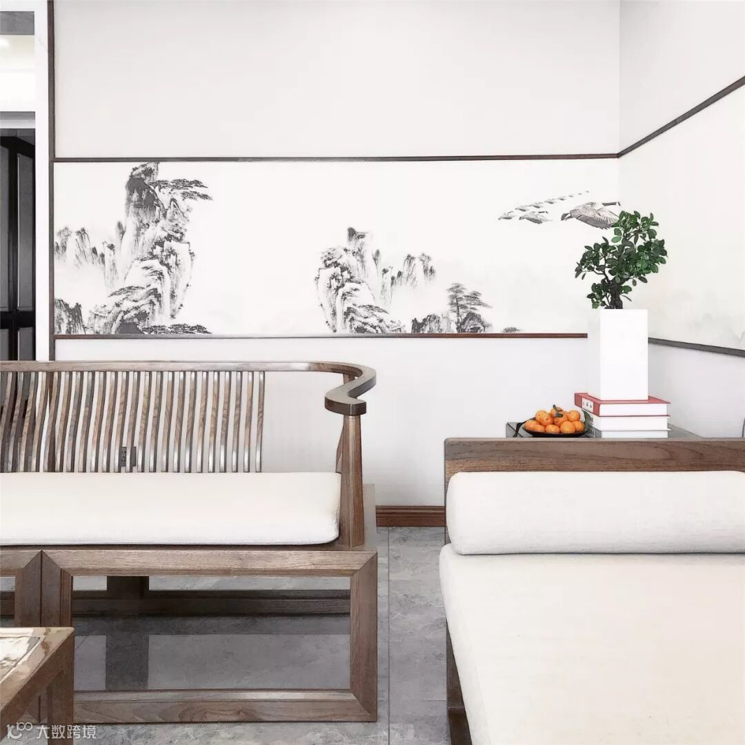 客厅的观山背景大气婉约,看似“简净”的设计,含蓄里带着对中式美学的独到理解与思考,既饱含写意画卷的淡淡山水又不失工笔技法的巧密精细。