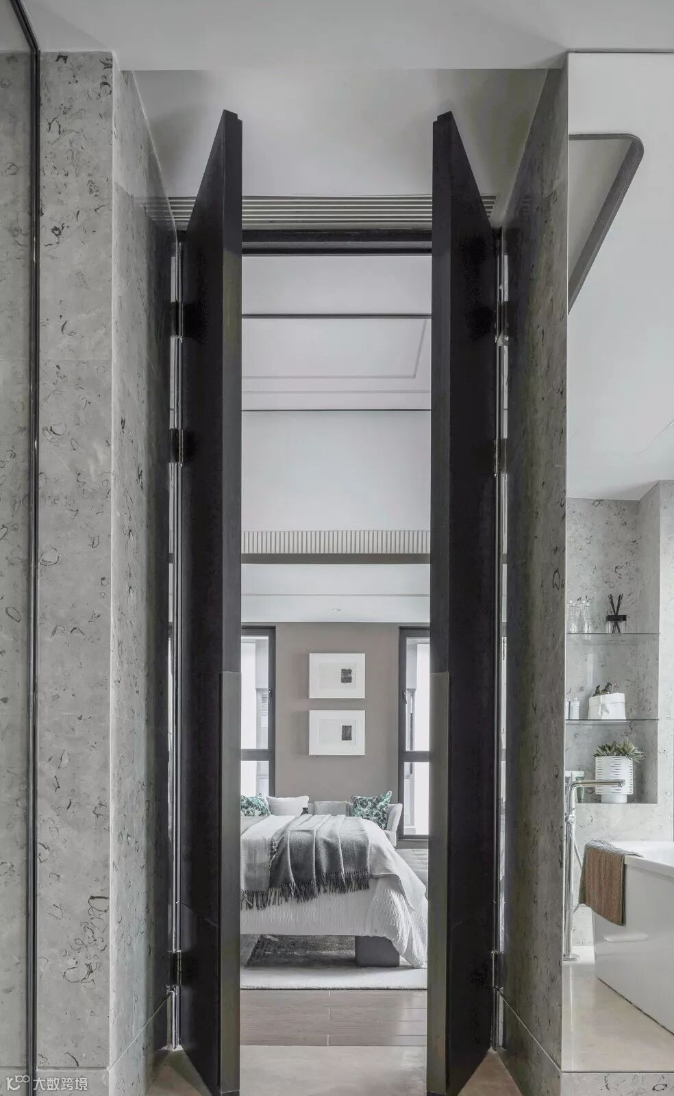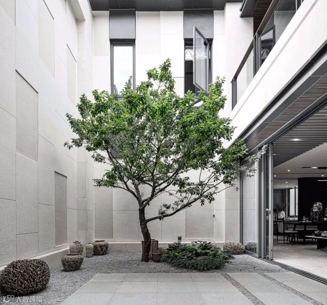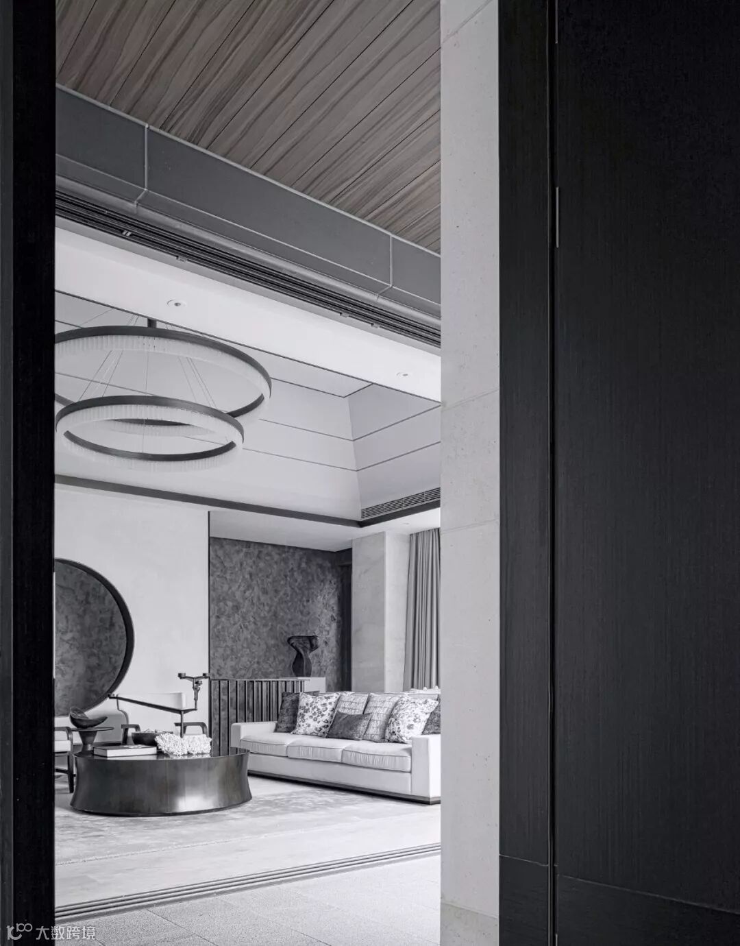 纯粹的黑白灰作为空间主色出现,旨在烘托出一种文雅与风度,墨色的背景墙透过月洞门,又宛如远山萦绕,言有尽,而意无声。