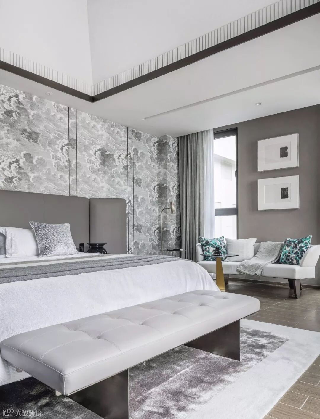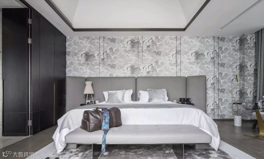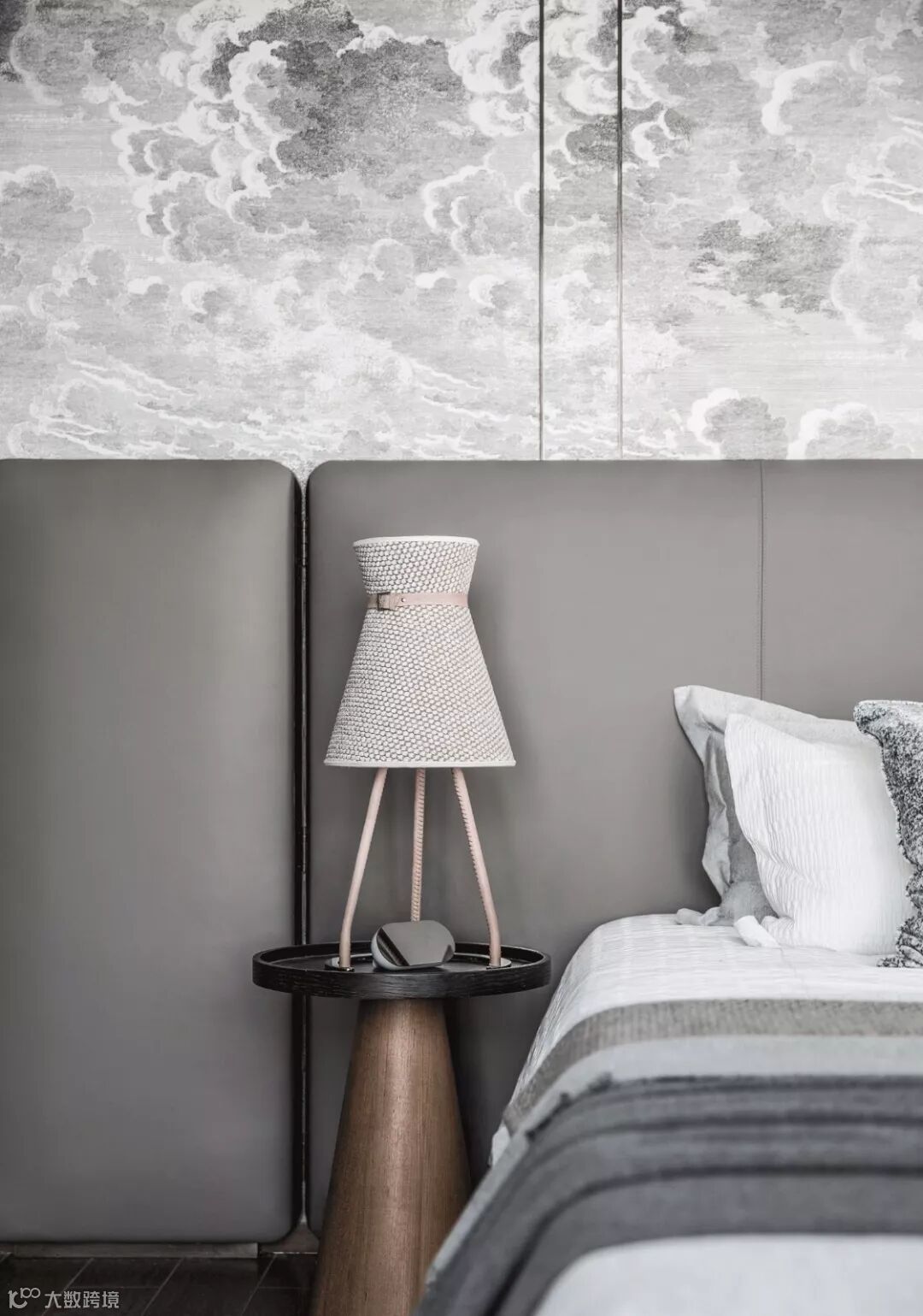 主卧位于庭院侧边,大面积的祥云壁纸形成了空间视觉的聚焦点,融入生活的气息后,‘山’ 、‘水’、‘云’被巧妙安放于这一方小天地,让城市的繁华消隐于闲适之间。