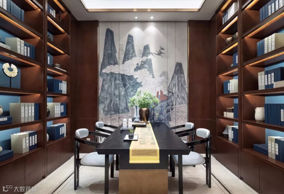 《祥验记》:“鹿者,禄也。”一尊梅花鹿雕塑栩栩如生,矗立在茶几之上。圆形水晶吊灯洒下静谧的光阴,天圆地方的抽象造型寓意和谐完满。翠蓝色丝绒沙发,黑檀茶几,金属山型装置,抽象挂画随机映入眼帘,现代的设计手法、颇具新古典韵味的家具与东方古典装饰元素自然斜街,设计师巧妙呈现西形东韵的空间气质。