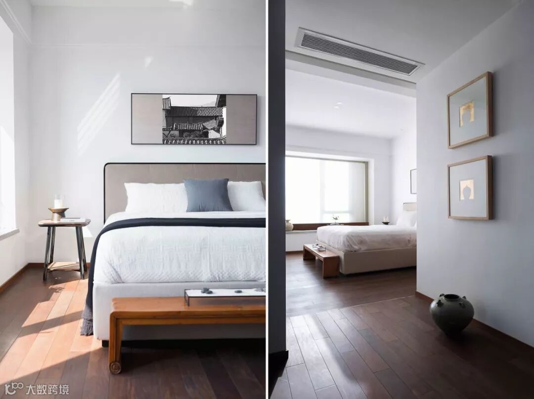 主卧设计从传统艺术形式的留白、简约、隐喻中提取灵感,结合朴拙的物件,形成视觉上的碰撞与冲突,赋予空间艺术意境,皆成妙境。