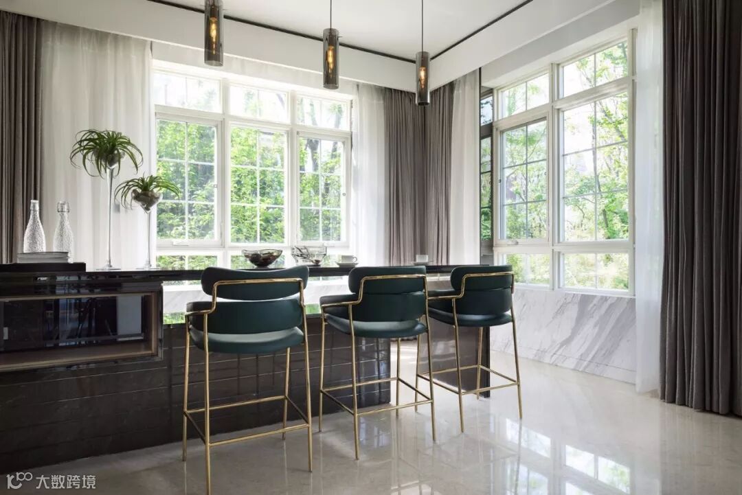 金色的细椅腿,搭配祖母绿软包,空间抒写着优雅情调。色泽深邃的大理石桌柜连接墙体与地面,品质承袭之余,亦平衡了设计的美学与功能特性。