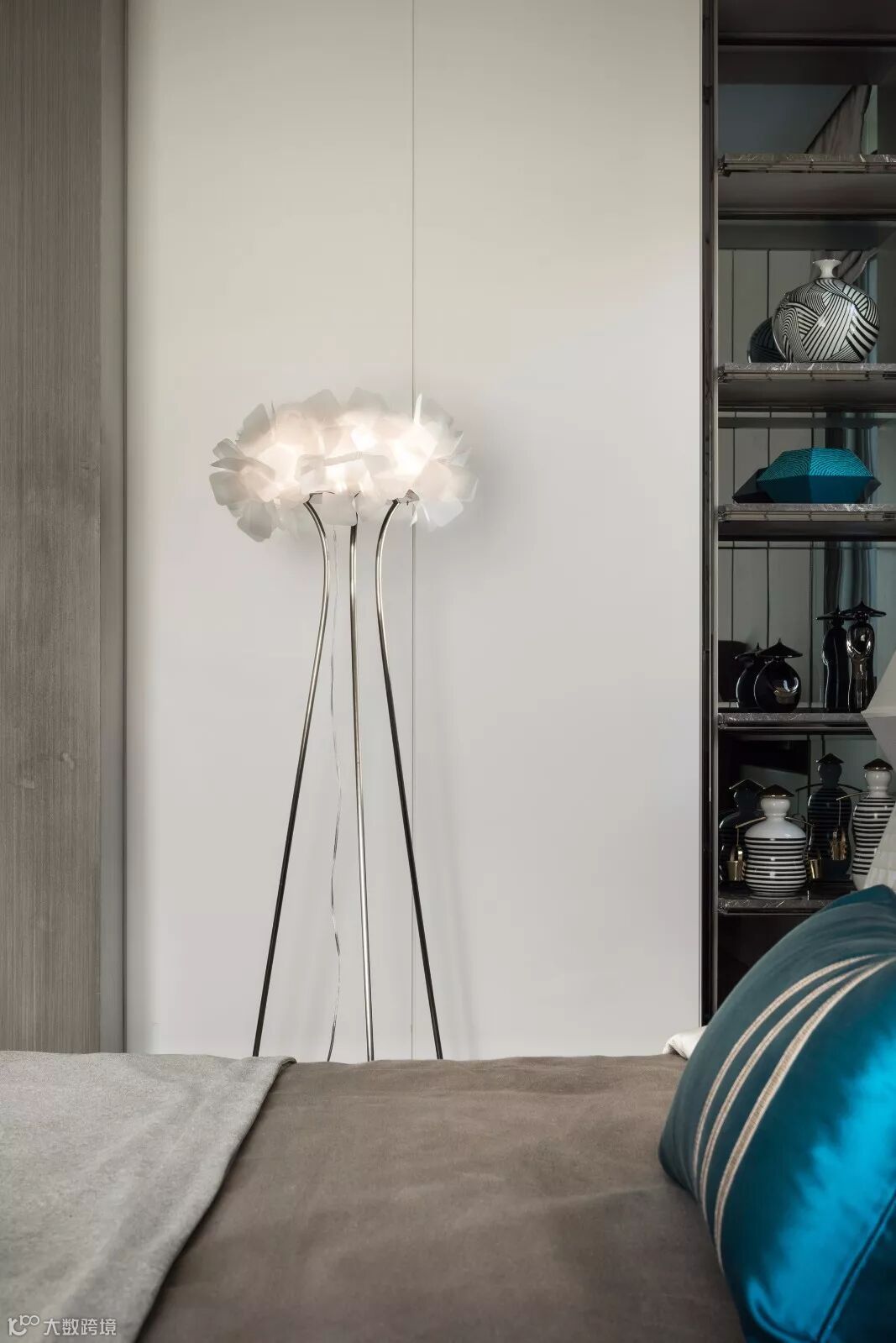 次卧设计以温柔的灰色为主调,翠绿色透明灯饰的置入,让空间更显得清透明净,内敛中透着优雅气质。