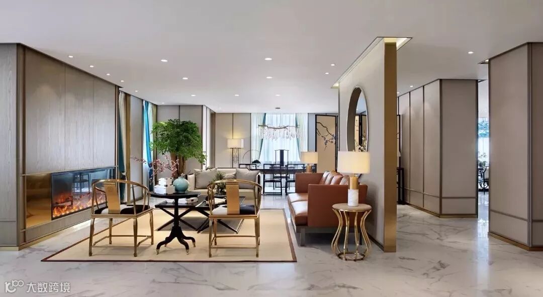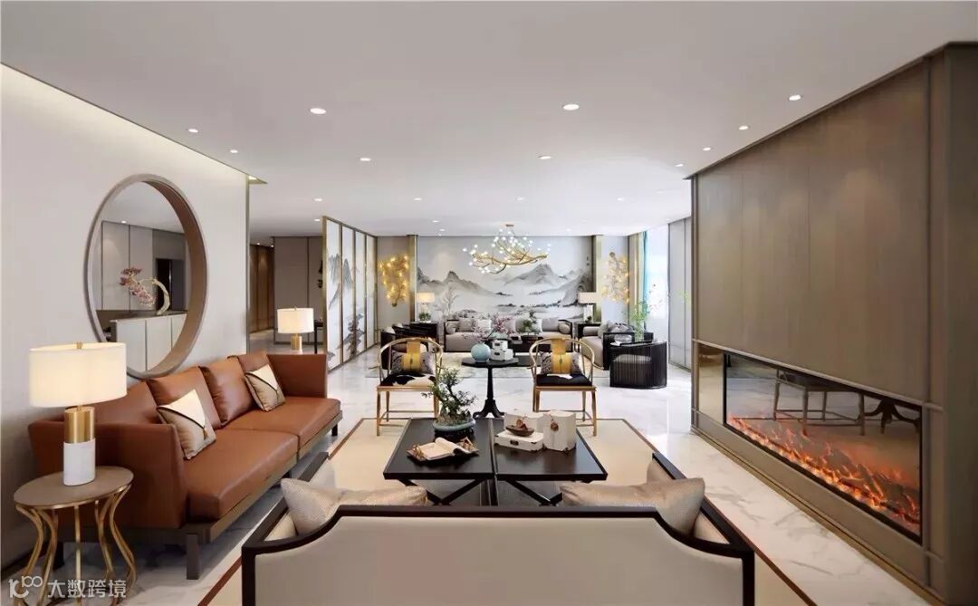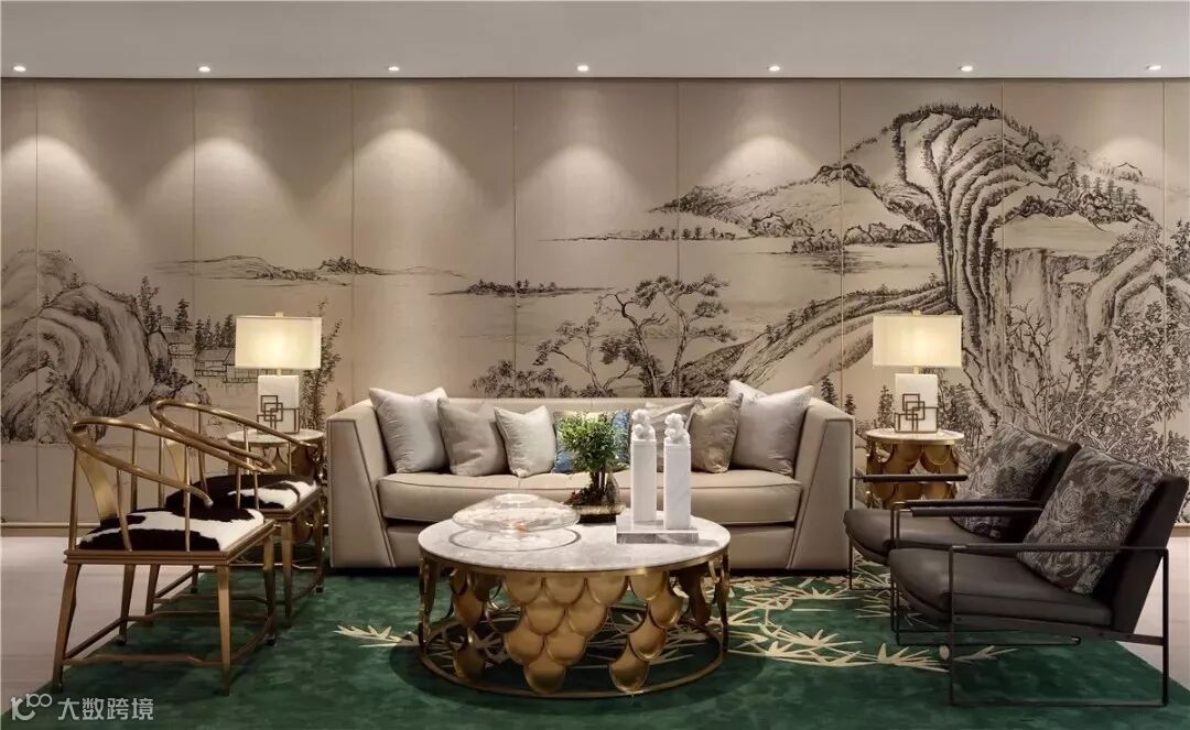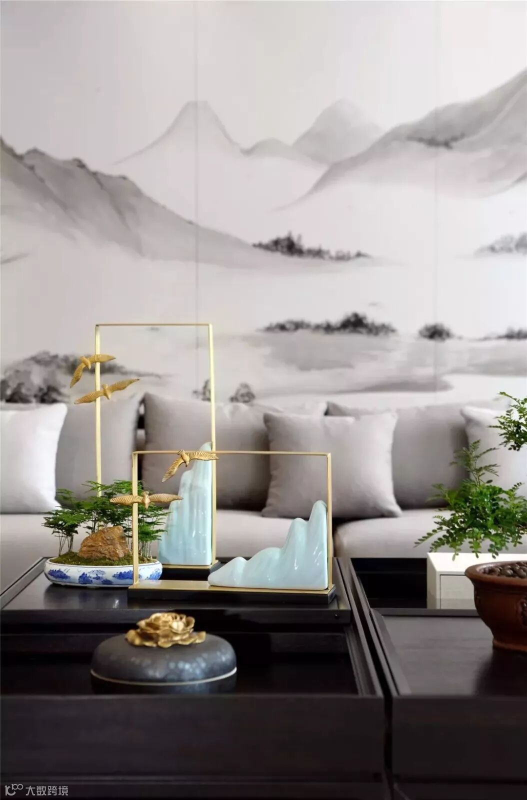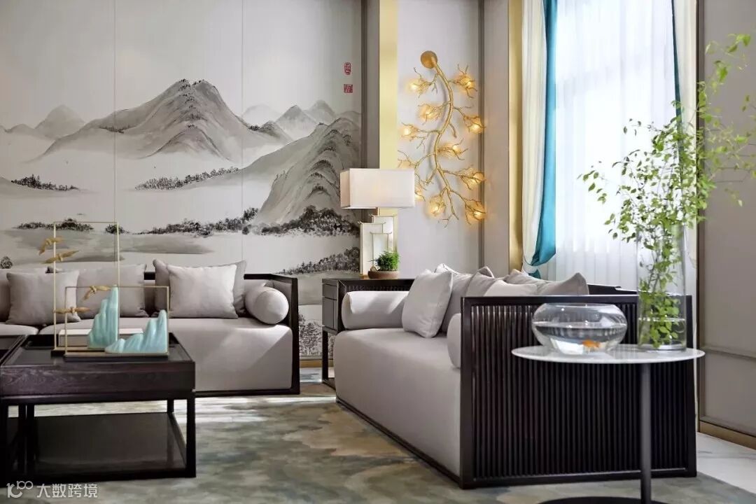 设计师将中国水墨画植入到当代设计语言之中,通过“山”、“水”“桃花”等元素,让置身其中的业主感受到世外桃源的情境体验。