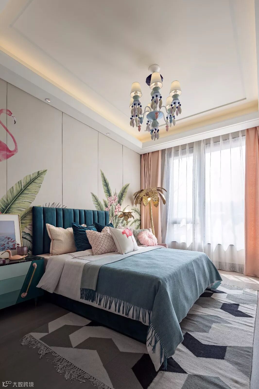 次卧空间的氛围如梦似幻,优雅中不失灵动,青春中带着俏皮。游走其中,仿佛身处花海,时空交织又挥散不去,化为一场永不愿醒来的梦境。