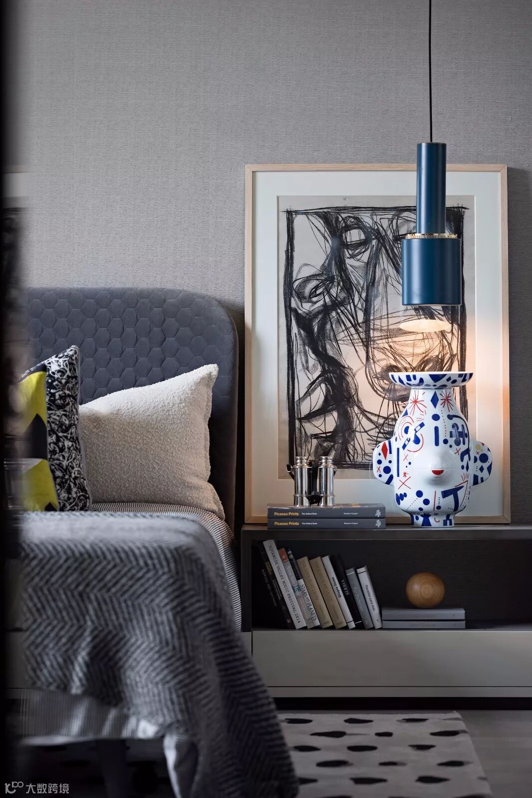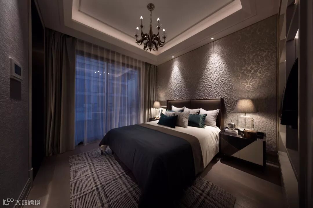 素雅卧室空间带着浓重水墨色彩的几何,图案和肌理彰显出巨大的张力使得视线得以集聚。