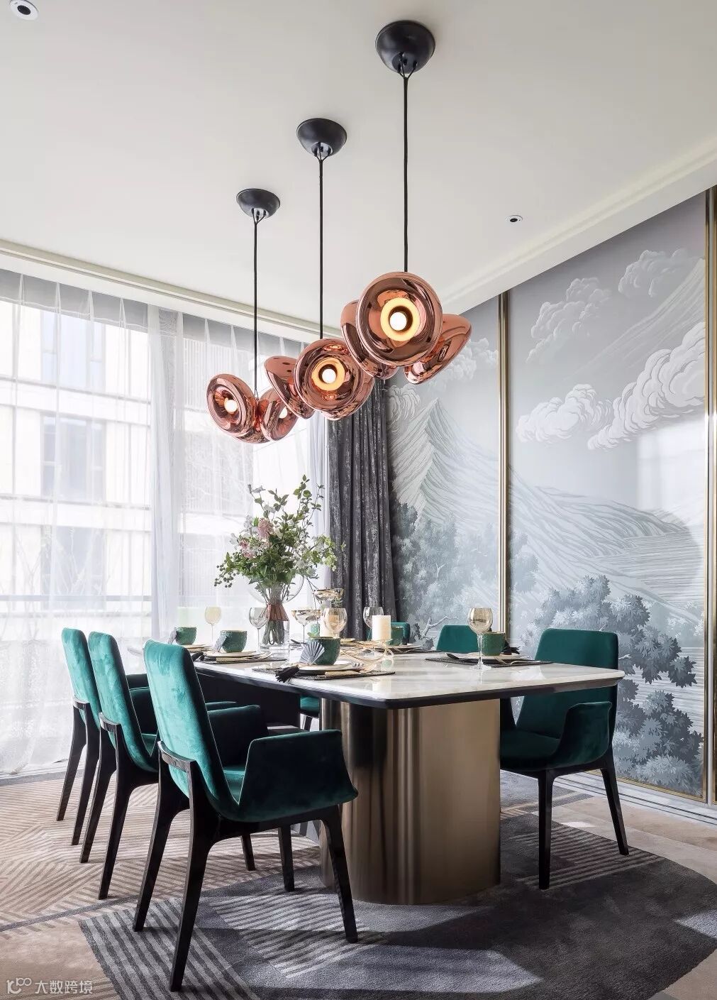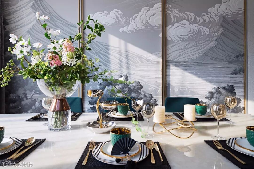 中式风格的壁画,做工精巧的餐具,金属线条的勾勒,碰撞出极具韵律感的视觉冲击,无不散发着奢华、雅致的空间气质。