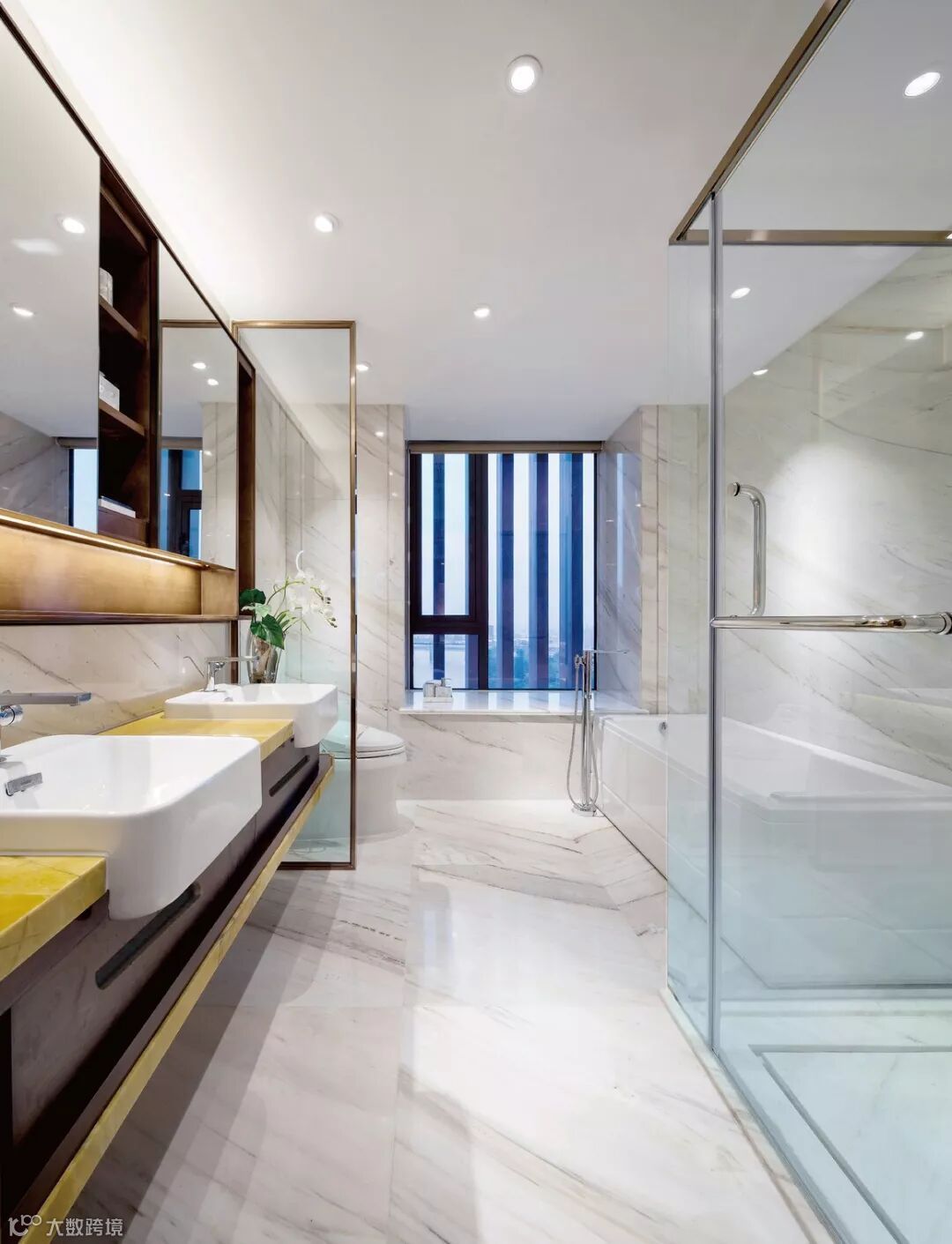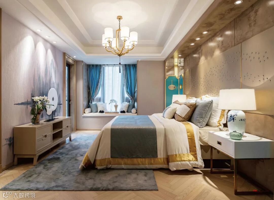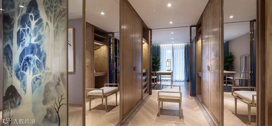 主卧的空间宽敞舒适、优雅低奢,兰色,金色作为辅助色。佐夜色,暖灰与兰色的床品,在金色线条感与主题墙面山水铜钉与皮革纵横的堆栈中,床头两侧的兰金色屏风把空间围合起来,将龙山光氛的氤氲带入宁静惬意的休憩氛围。
