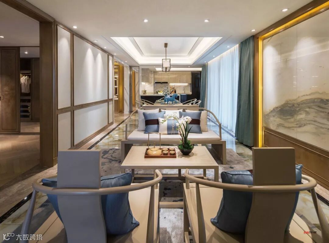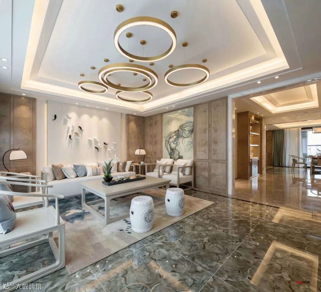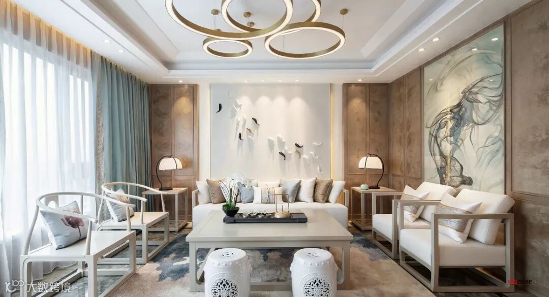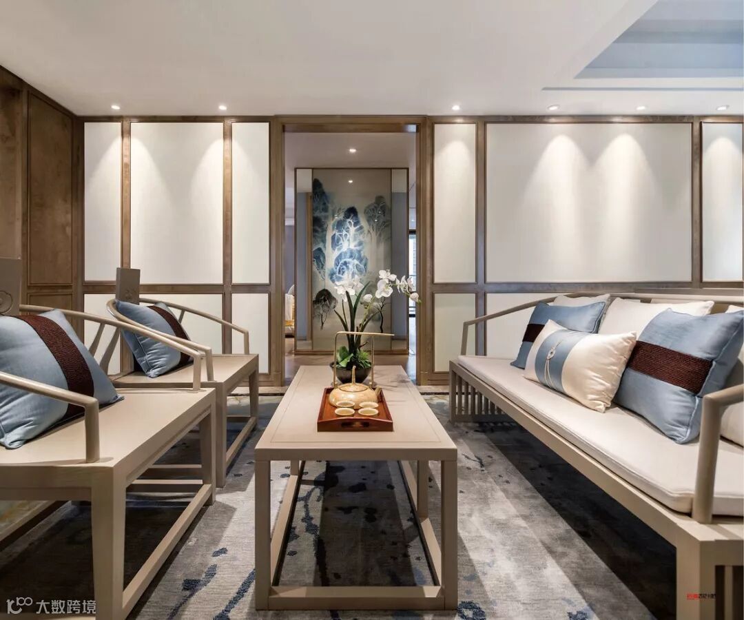 本案运用山水文化为主题设计,并使之成为贯穿于整个空间的一大特色。好的风水世人所求,好的字画亦惠泽八方。客厅的空间处理简洁利落,宽敞明亮。