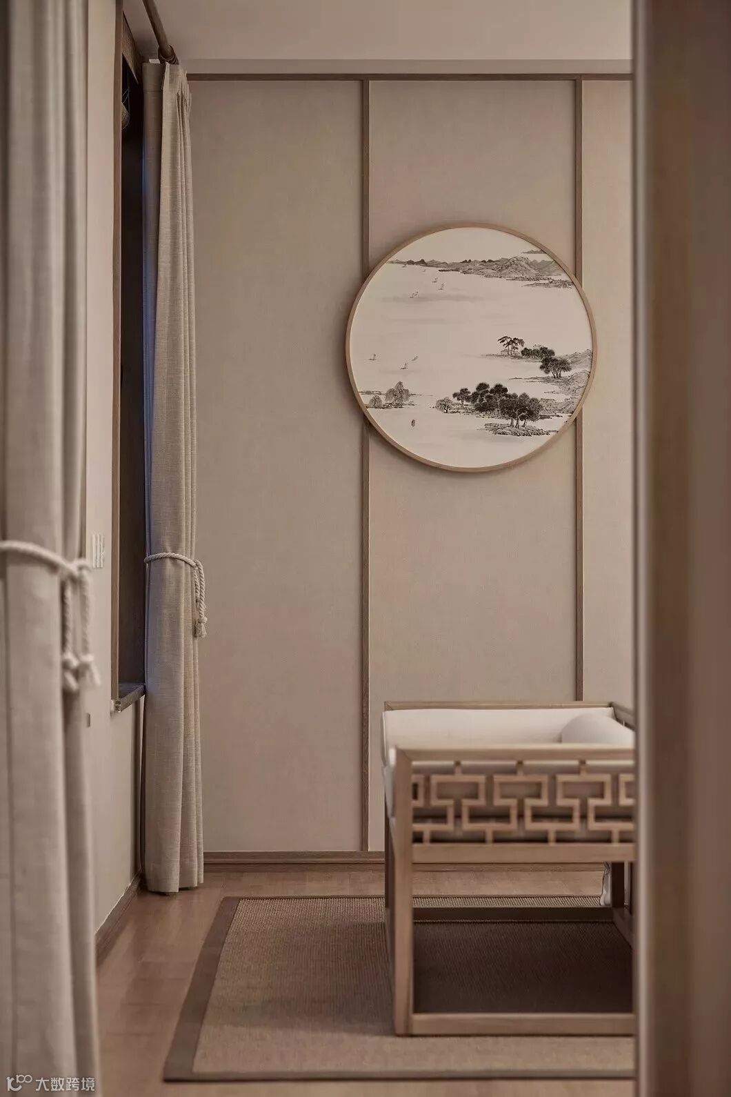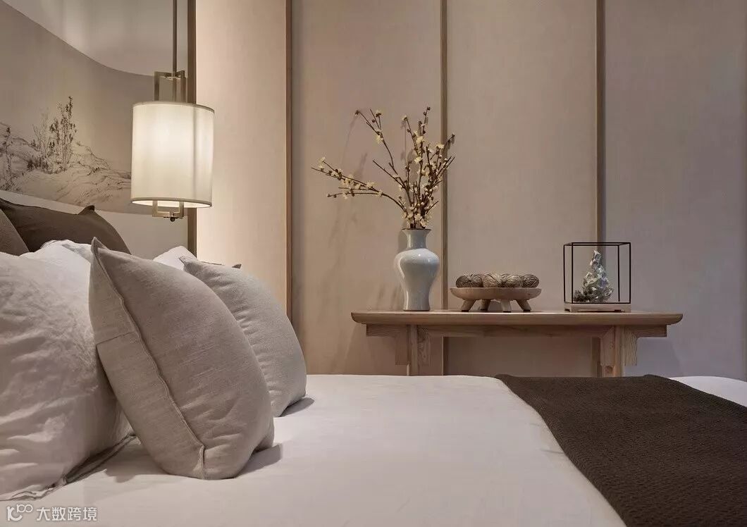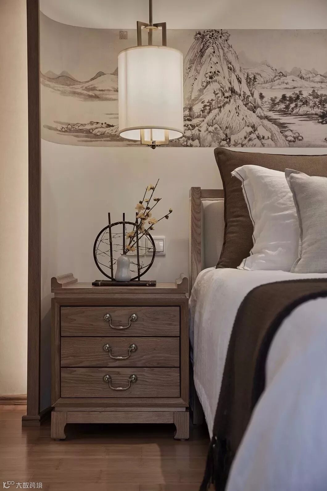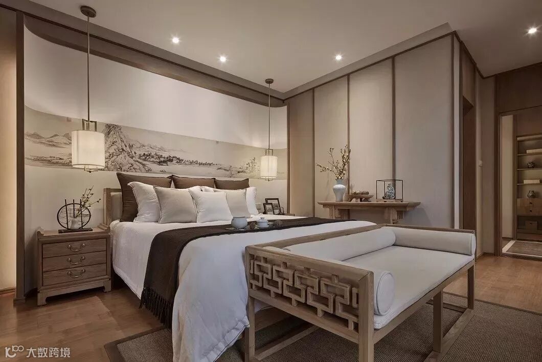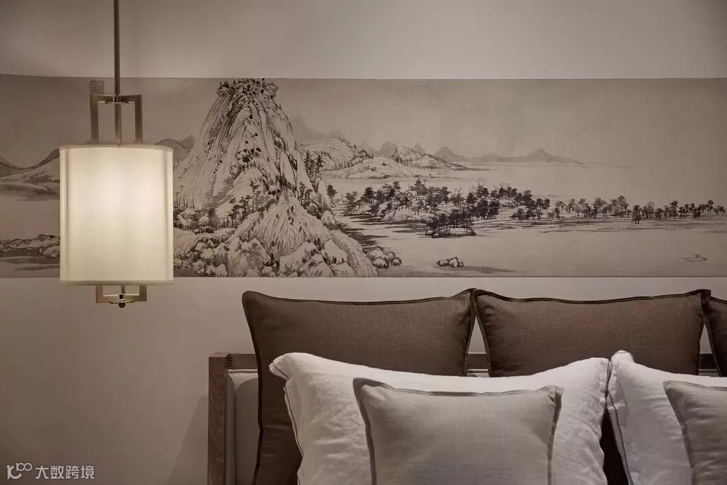 主卧的背景墙依然延续客厅的画卷概念,《剩山图》作为原画的开篇,整体悬挂在屏风上大气磅礴,呼之欲出,地板选用竹木,也从材质上突出高雅。