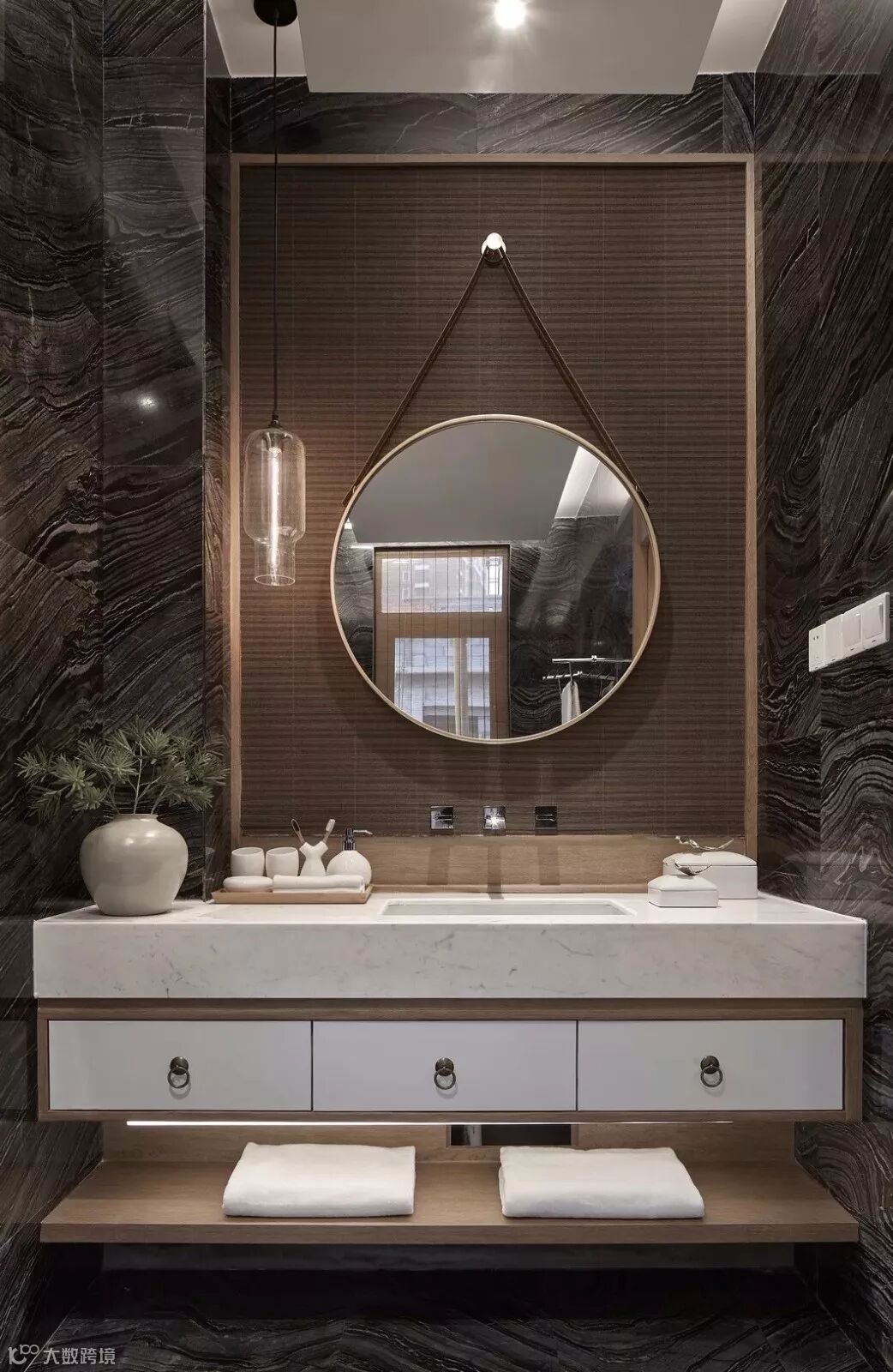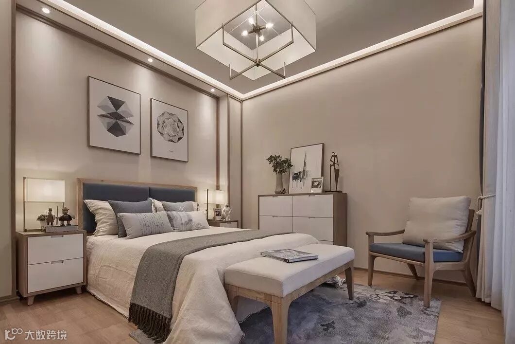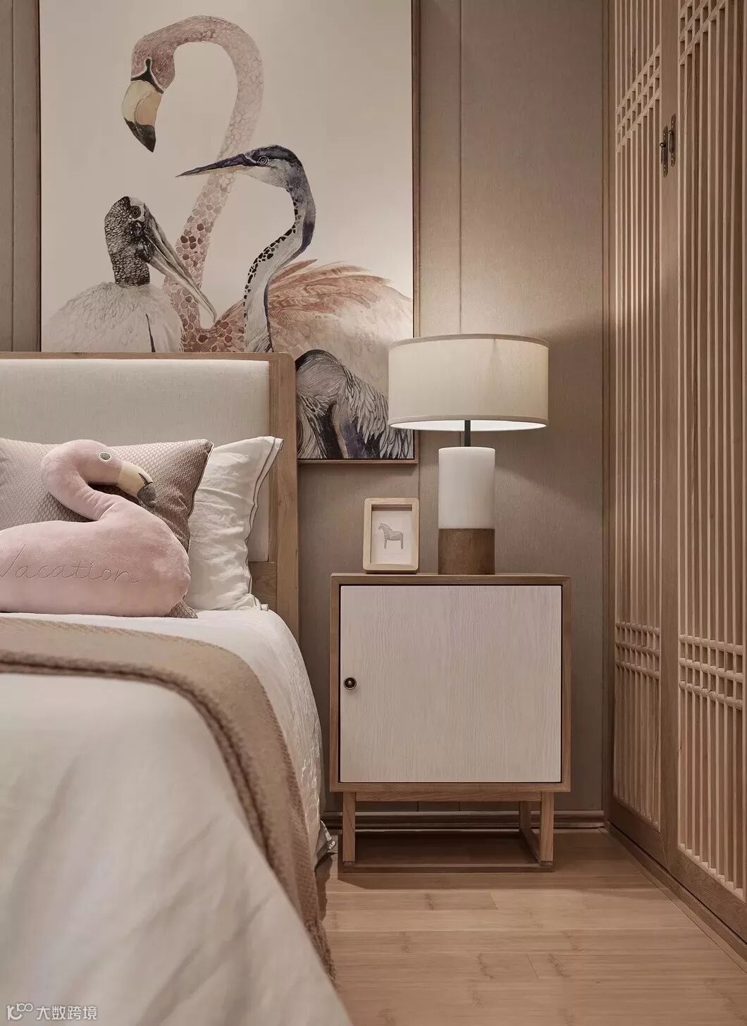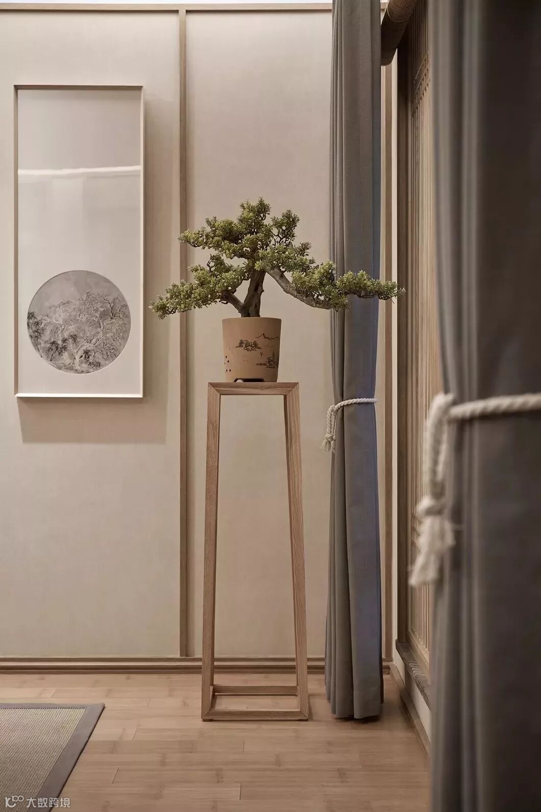 主卧的背景墙依然延续客厅的画卷概念,《剩山图》作为原画的开篇,整体悬挂在屏风上大气磅礴,呼之欲出,地板选用竹木,也从材质上突出高雅。