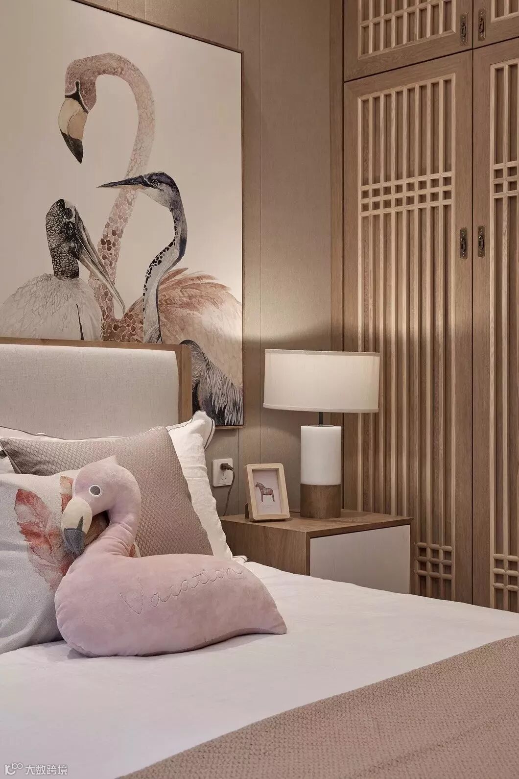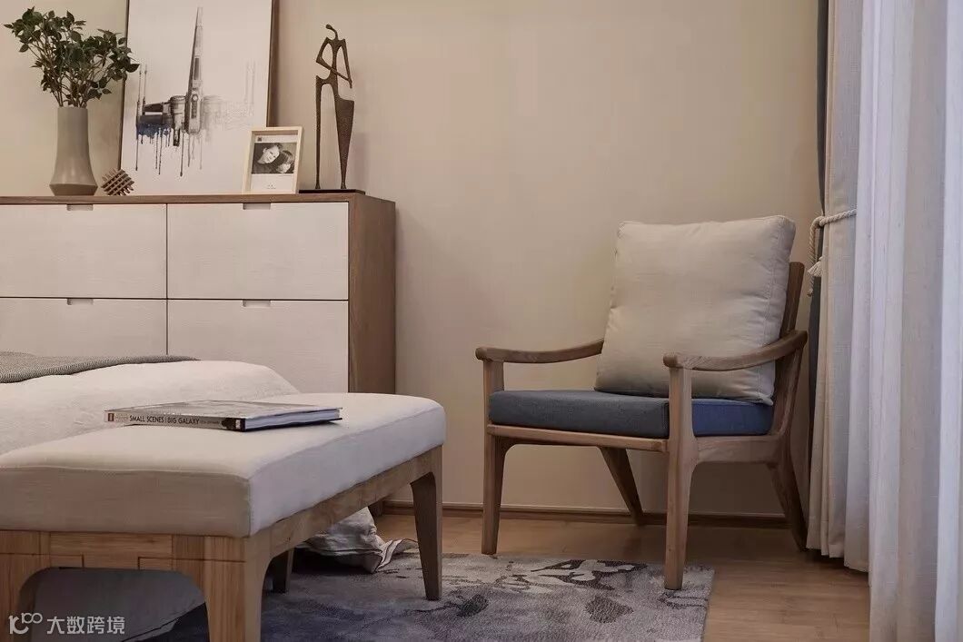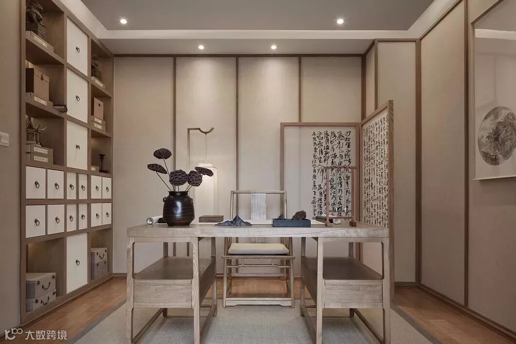 书房书柜的药箱又延续餐厅的创意,如同屏风上王冬龄的书法,自由中带着秩序。