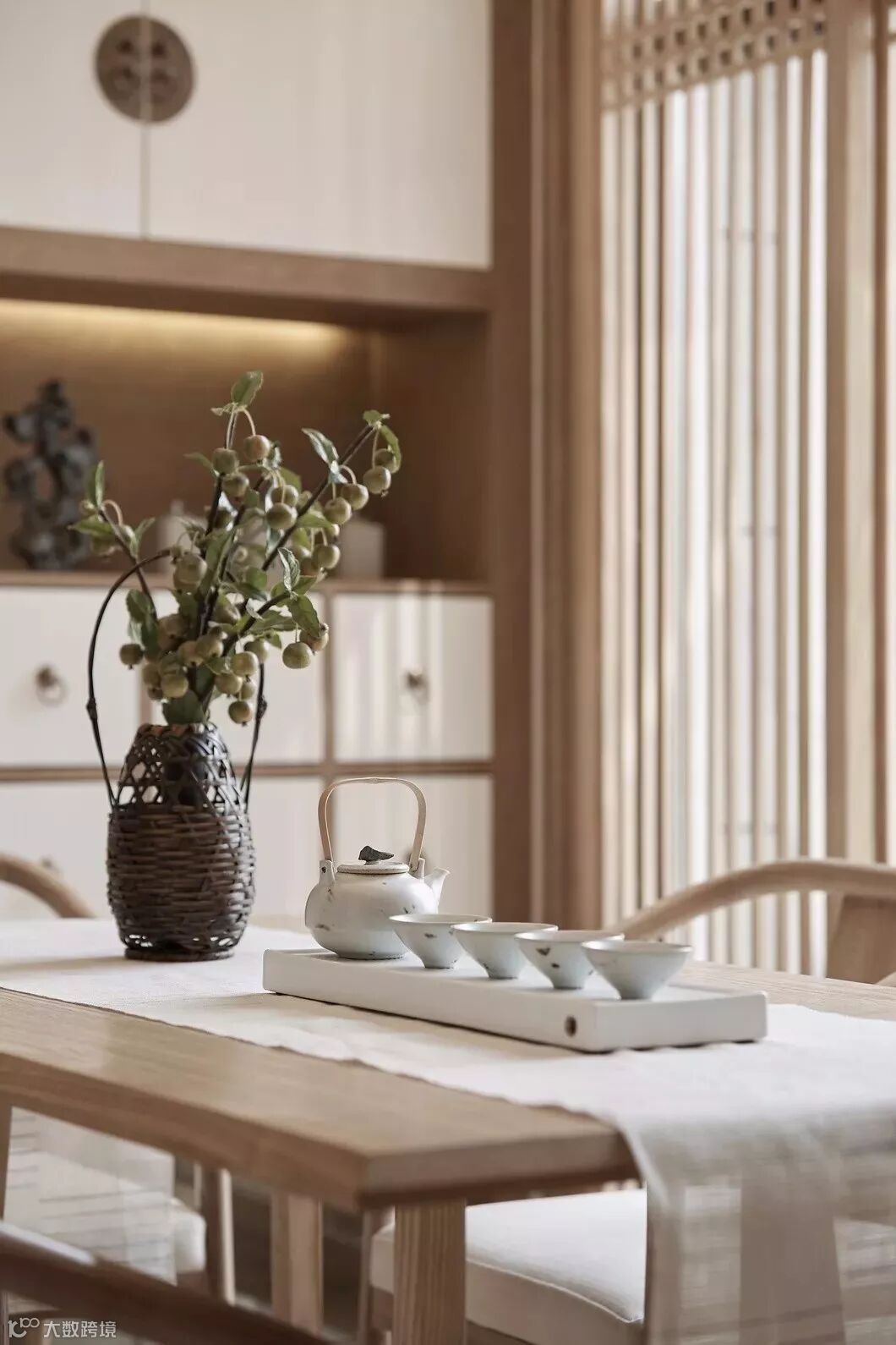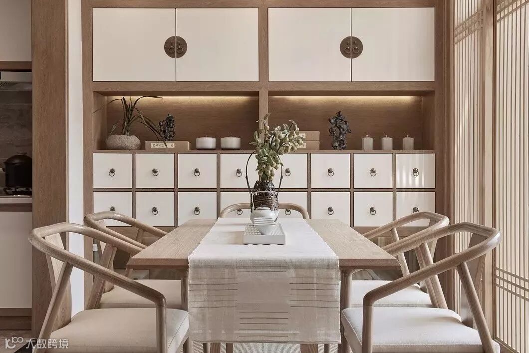 餐厅是通往庭院的主入口,我们将玻璃推拉门处理成和式木质推拉,既保证了使用功能和采光,也能和客厅的背景墙相统一。