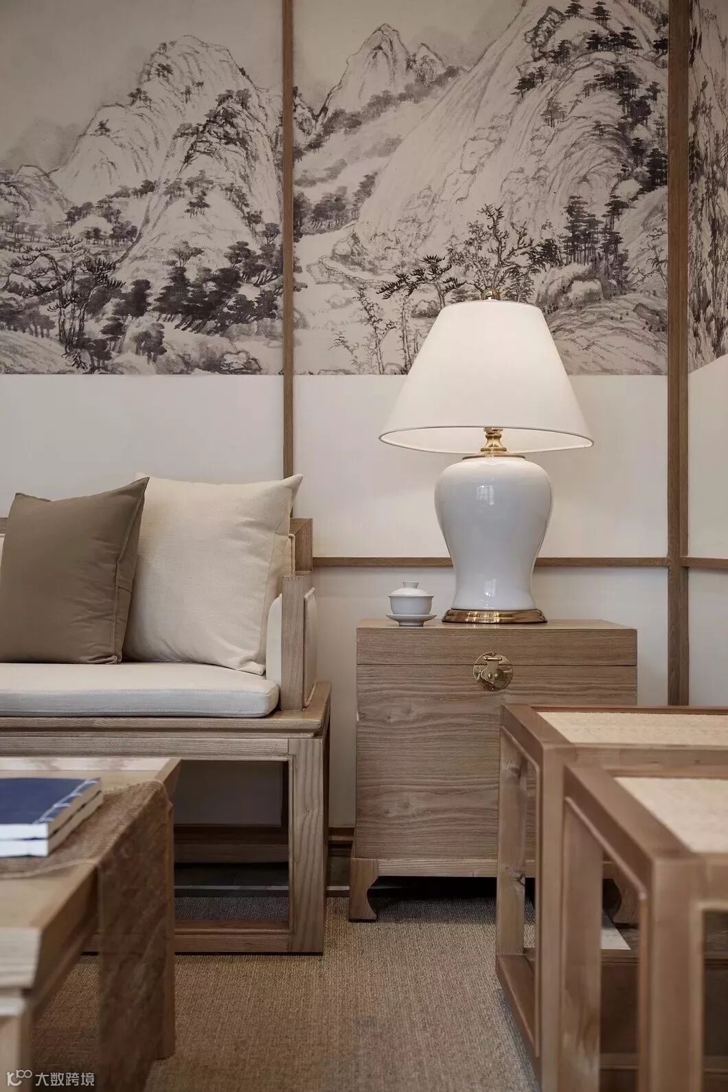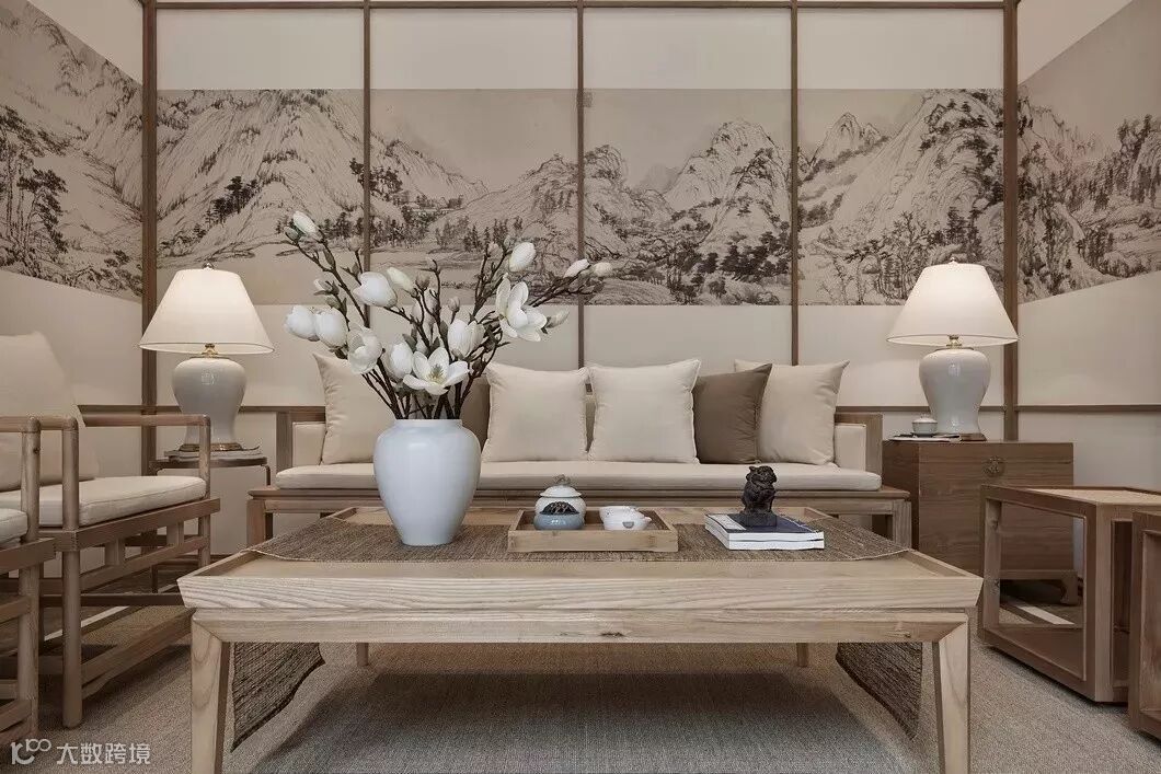 将原画的精华部分选取局部并用宣纸制作出来作为客厅的主背景,像画卷一样徐徐展开,电视墙我们放置在了庭院落地窗,即优化了使用空间,又可以让客厅正对庭院,闲时一盏茶、一枝花,尽享四时更迭。