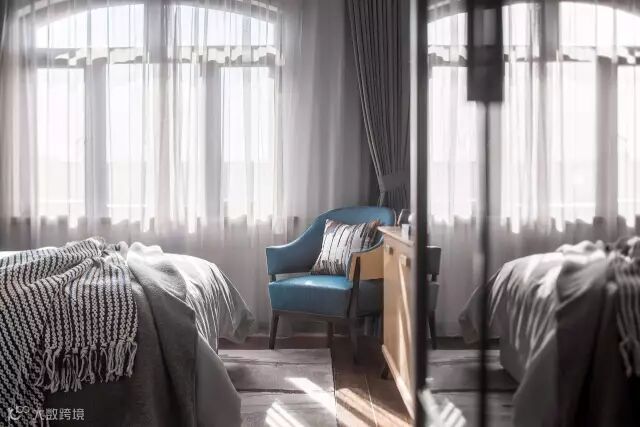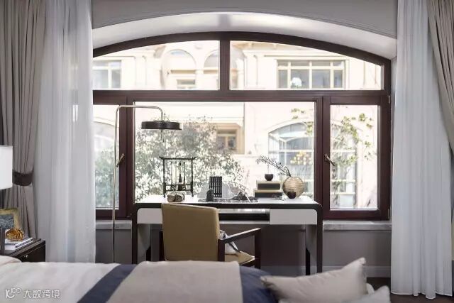 初入室内,便能感受到开阔视野,明亮透彻的落地窗上高悬象牙白的窗帘,即可伏案看窗外的物换星移,也让整个空间凸显连贯的完整性。