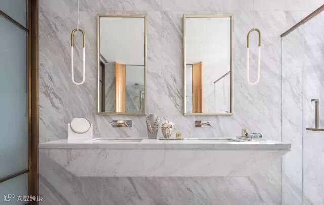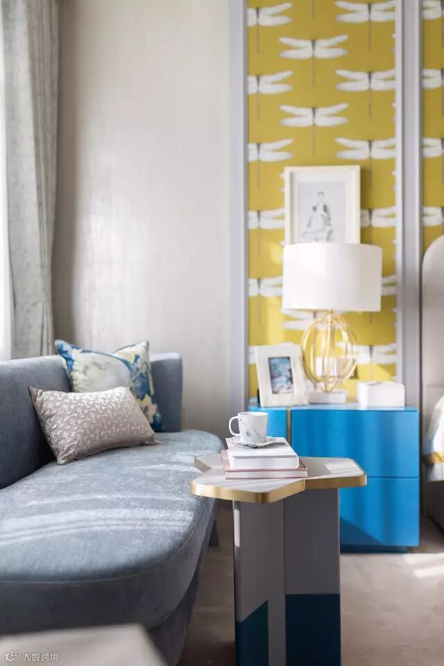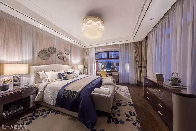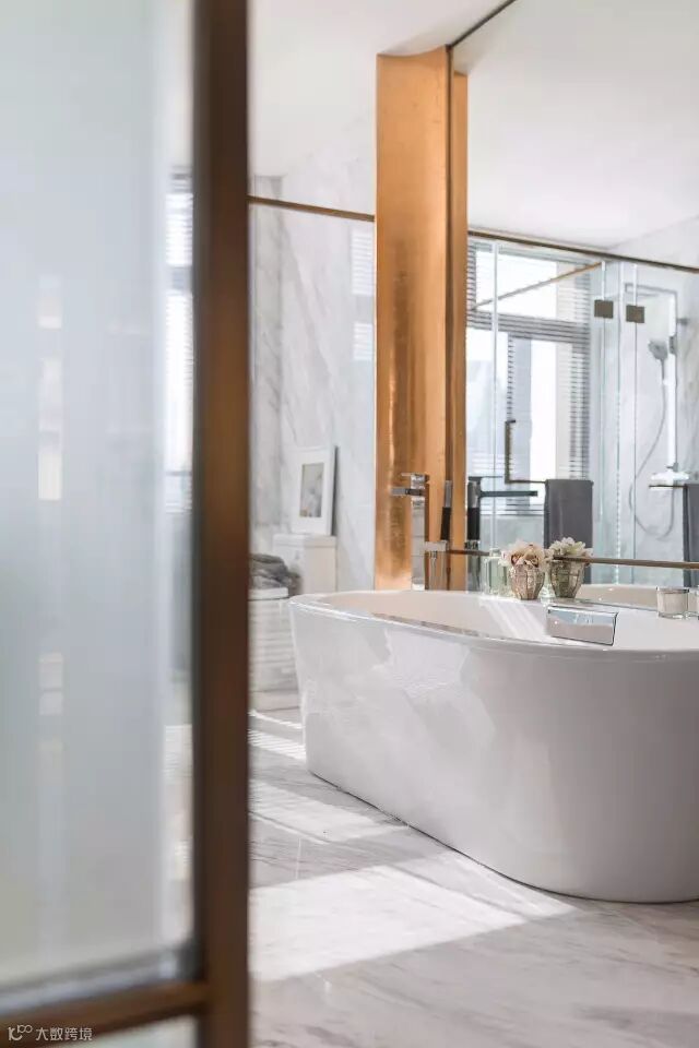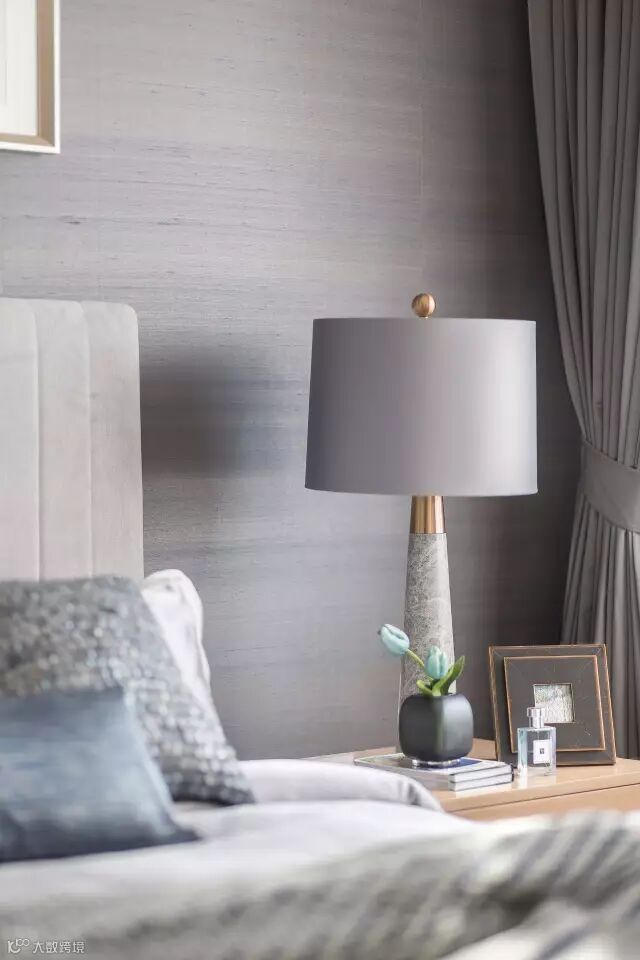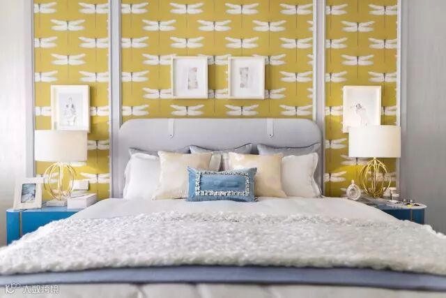 走进卧室,蓬松白洁的大床,金黄色线条点缀让整个空间极富唯美之感,仿若古希腊神话里游乐的场所。
