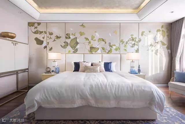床头飘落的银杏叶又让人仿佛置身古庙之中,参天的千年银杏叶纷纷洒洒。不仅混搭出视觉上的舒适体验,更是能在处处细节中感受到设计师的精心与诚意。