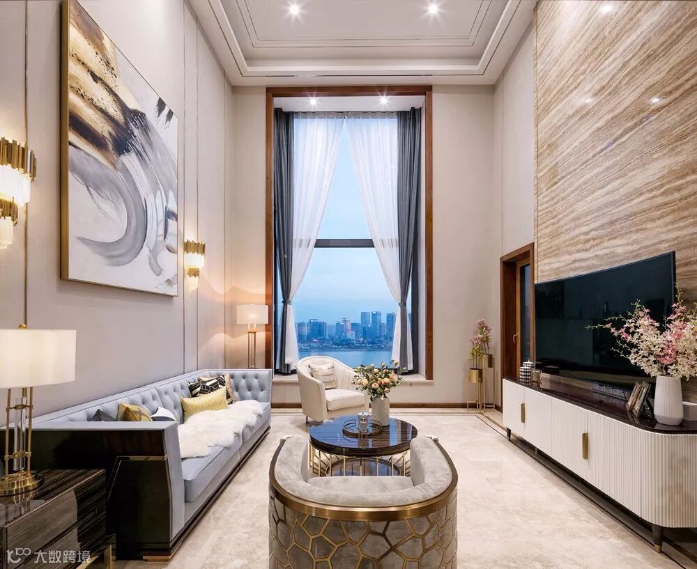 整体色调以暖色为主,搭配灰色系轻奢风格的家具,金色金属线条加以点缀,凸显整个空间简约而不失优雅。