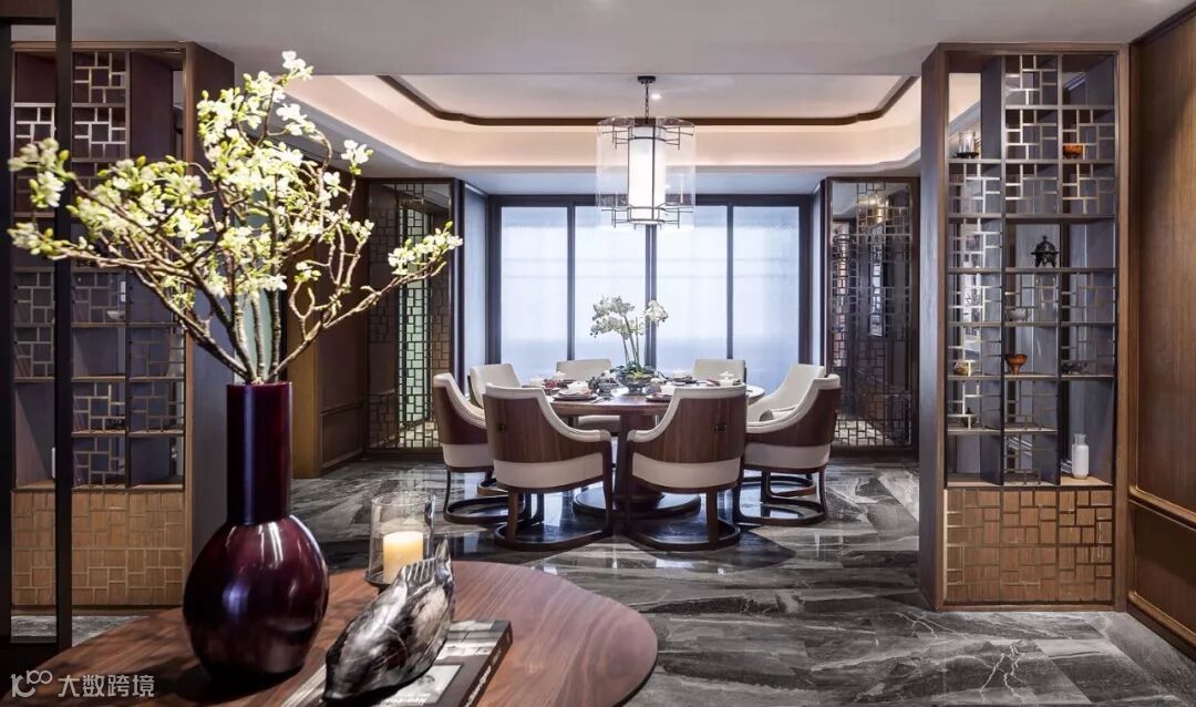 餐厅设计中的花窗元素透出中国古典韵味,结合精巧雅致的陈设,感受东方精神气韵的流露。