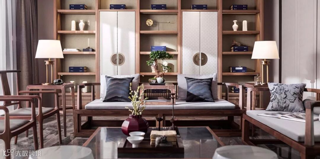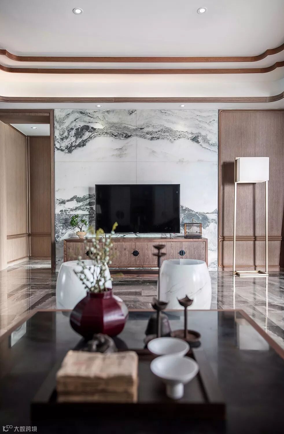 电视背景墙上浑然天成的水墨山石纹理是自然的艺术,用抽象表达意境,疏淡高远而清逸空灵。