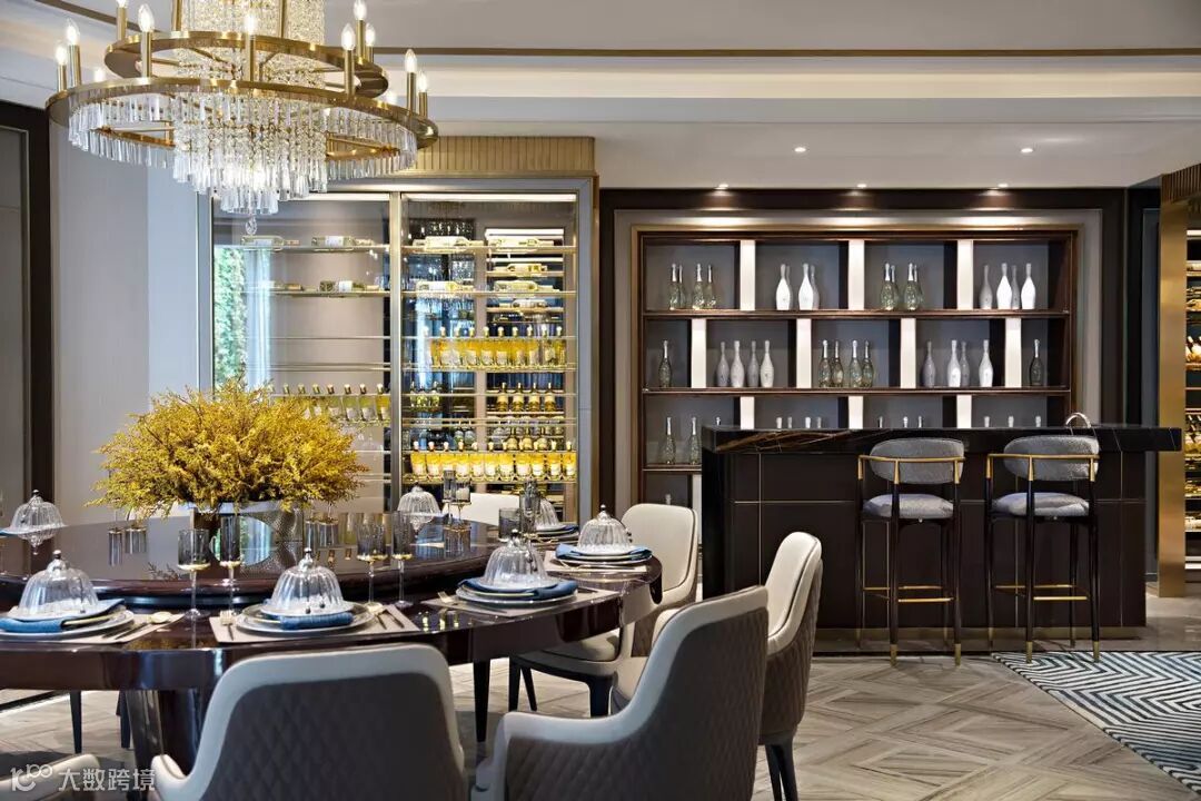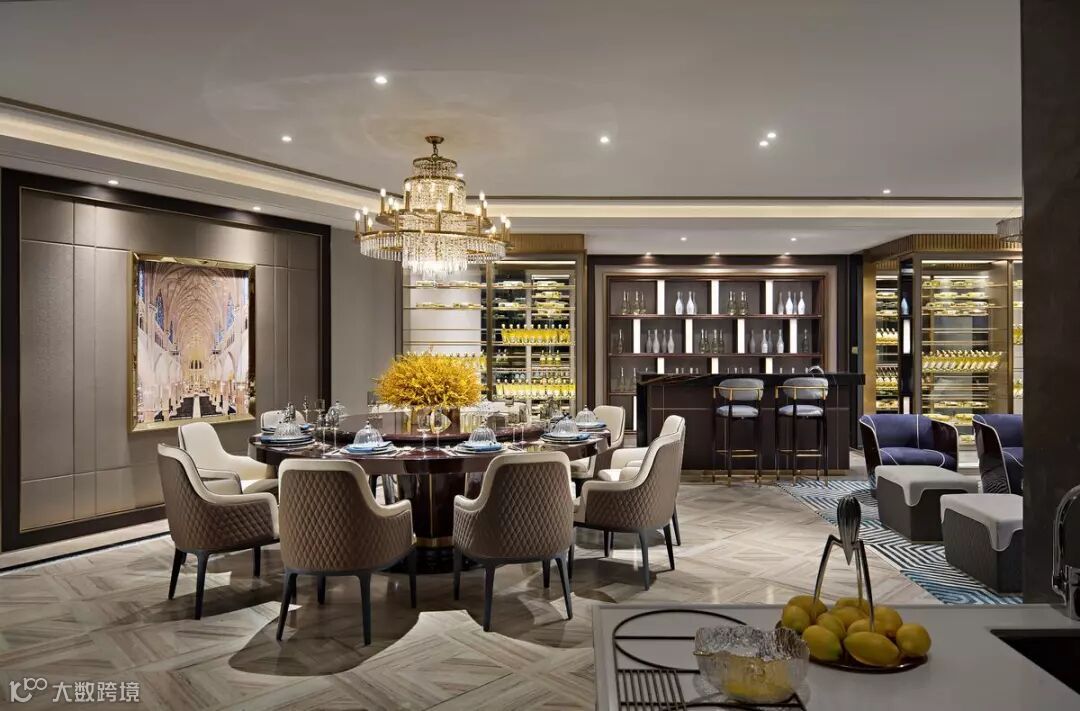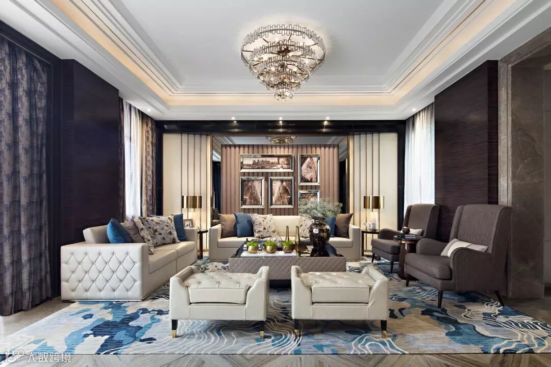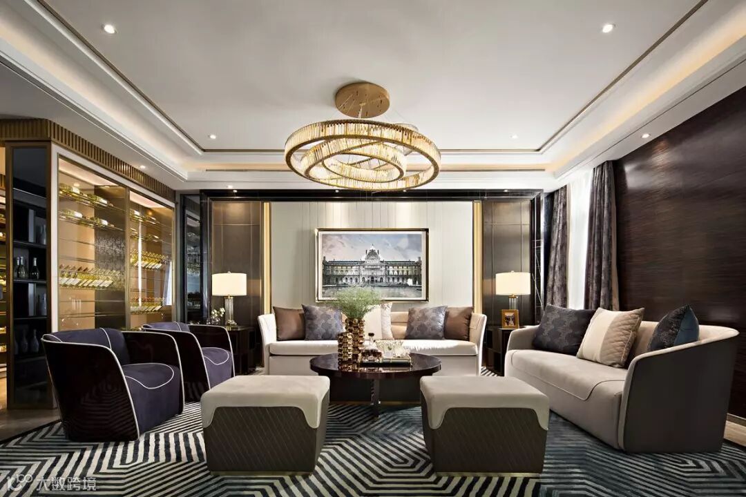 宴客厅,时尚大气的高级定制家具和宽敞的空间演绎世家风度。通过精简灵动的曲线,在创意吊灯、地毯等不同的“形”与“色”融为一体,突显艺术品位。