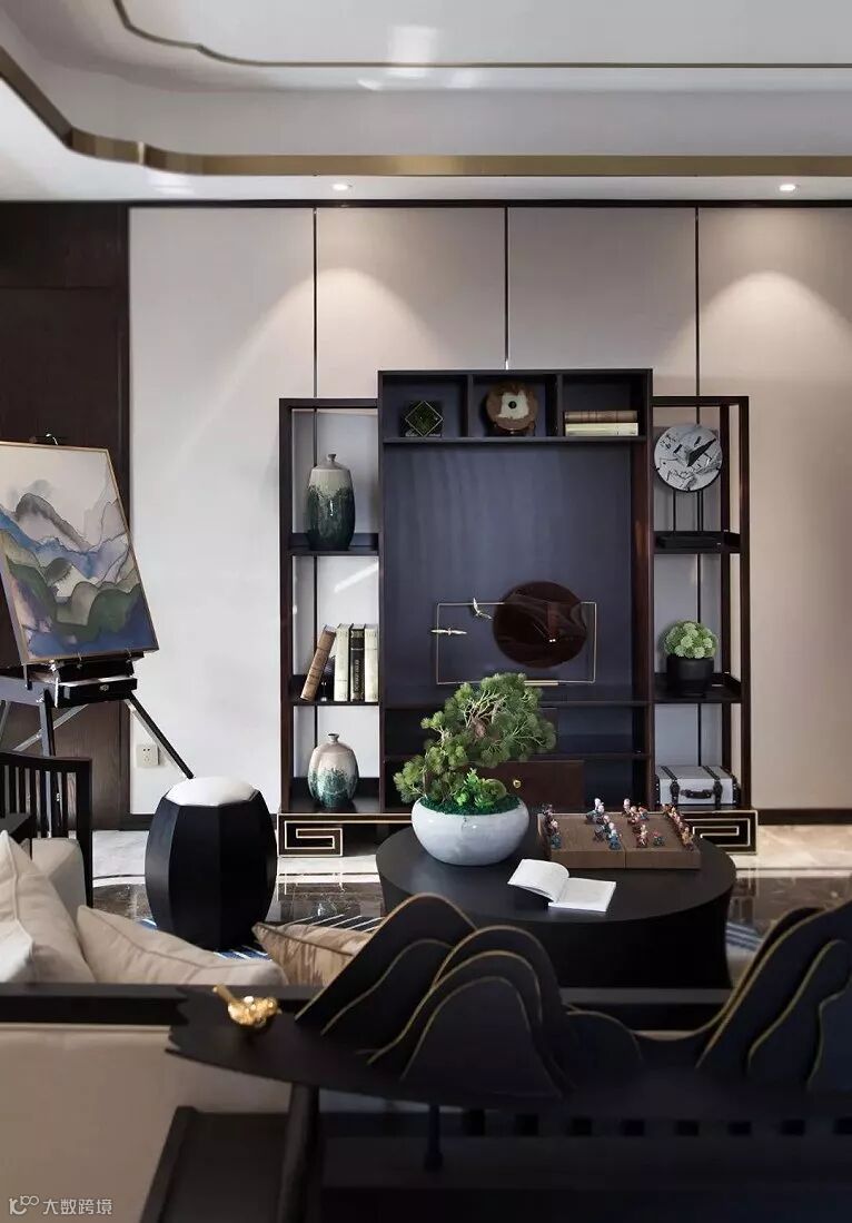 一层客厅以中式花鸟山水刺绣为主题设计弧形半围合背景,空间完整、丰富界面关系同时营造人文气息。整体的色调氛围灵感则源于水墨画黑与白的意境转化。