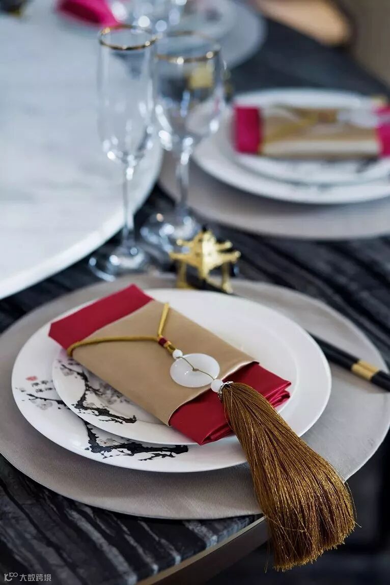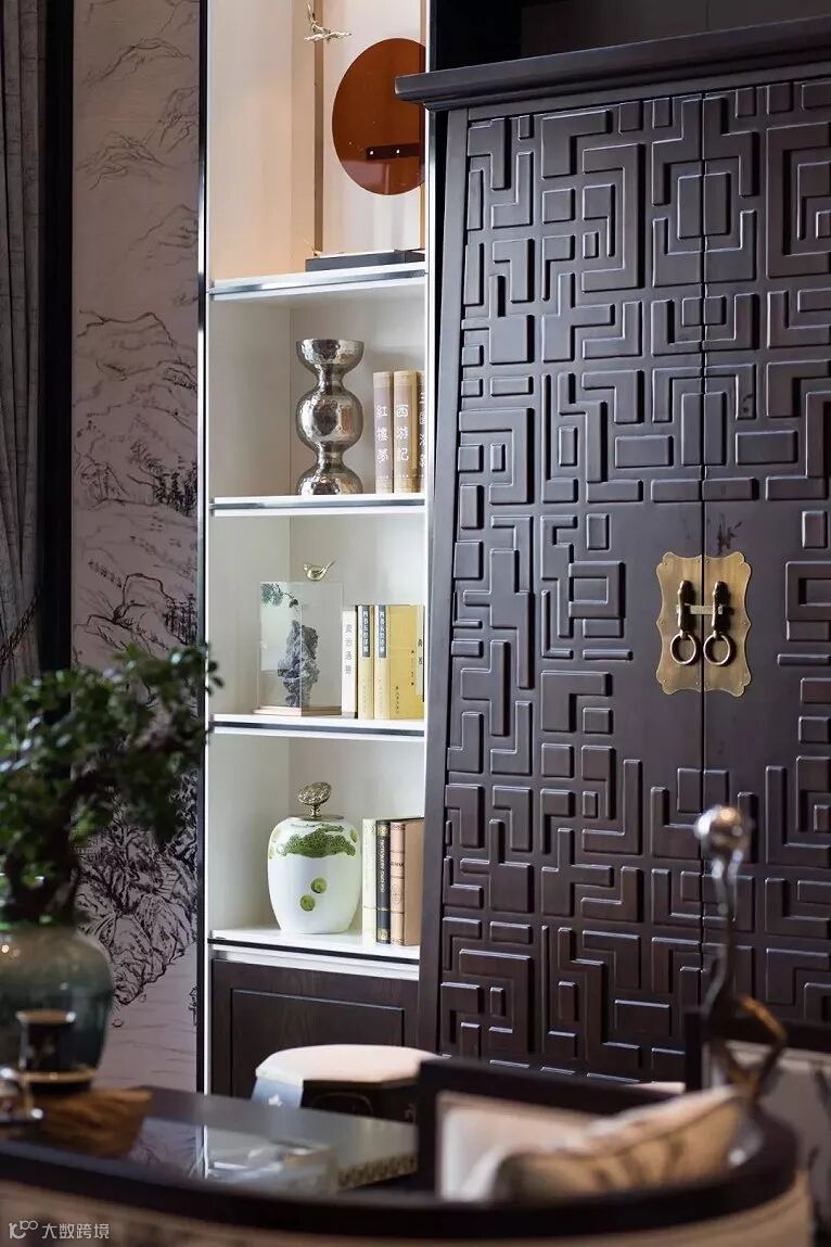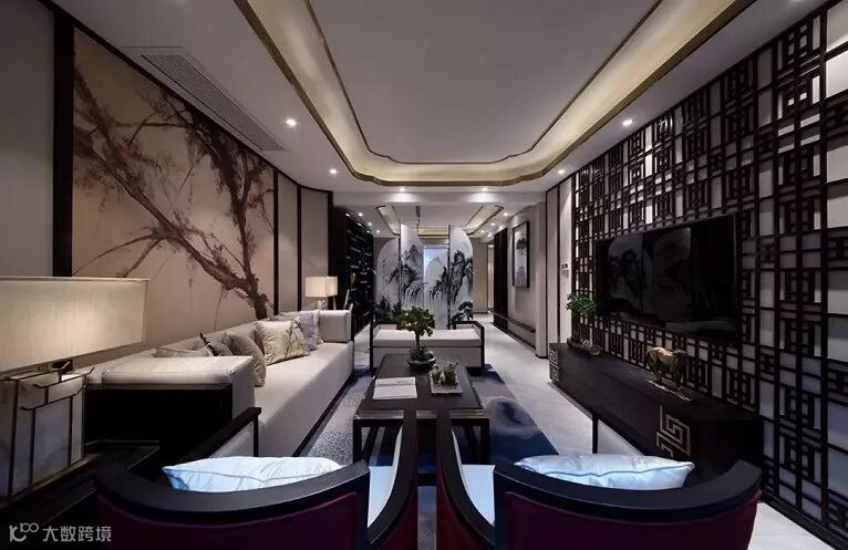 沙发背景以“福”字为原型,结合中国建筑中屋檐的形态进行重组。飞鸟立鹤,林泉流水,空间中动静结合的中式元素,让空间灵动而不喧闹,淡雅而不清寂。