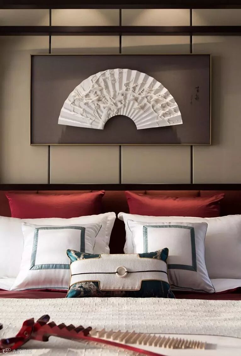 床头靠背墙采用米色硬包,提升空间装饰档次,增强空间细节及整体感。飞鹤立体画是一种淡泊宁静寓意的表达,让画不再只是一幅画,而是整个空间氛围中的一部分。