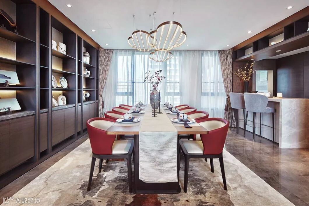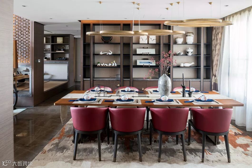 以酞青蓝、秋白、帝王红等搭配触感顶级的材质和人性化布局,整个空间都在「诉说」。捕捉东方韵味,表现金属的质感,庄重且不失刻板。