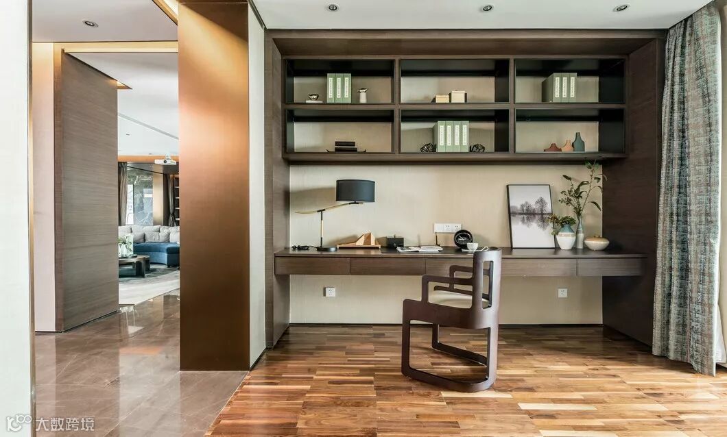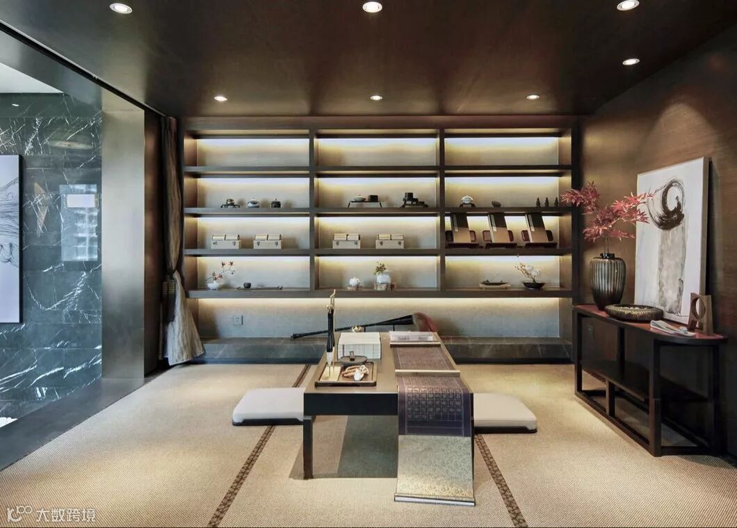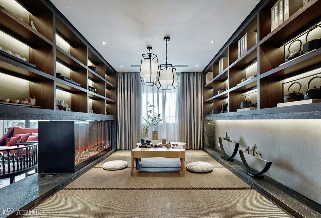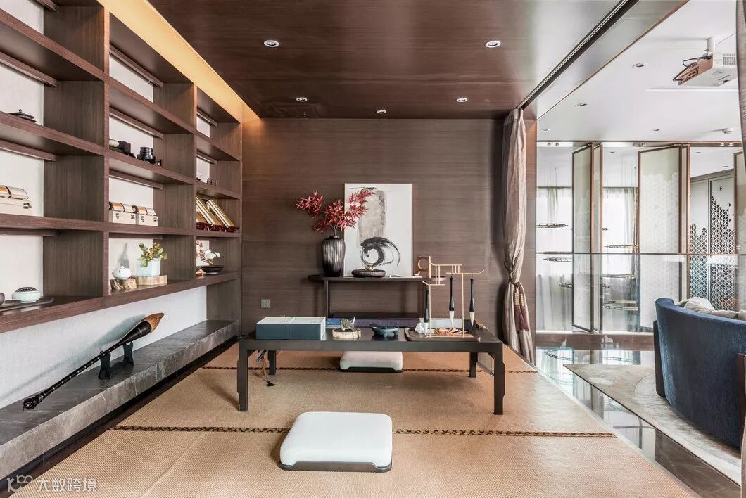 古典色彩+当代收藏,借由设计之手从古典东方的繁多形式中荡漾在整套空间中的「精神性」,拔地而起的满墙书架式设计,让立面更富有张力通达而有识鉴。