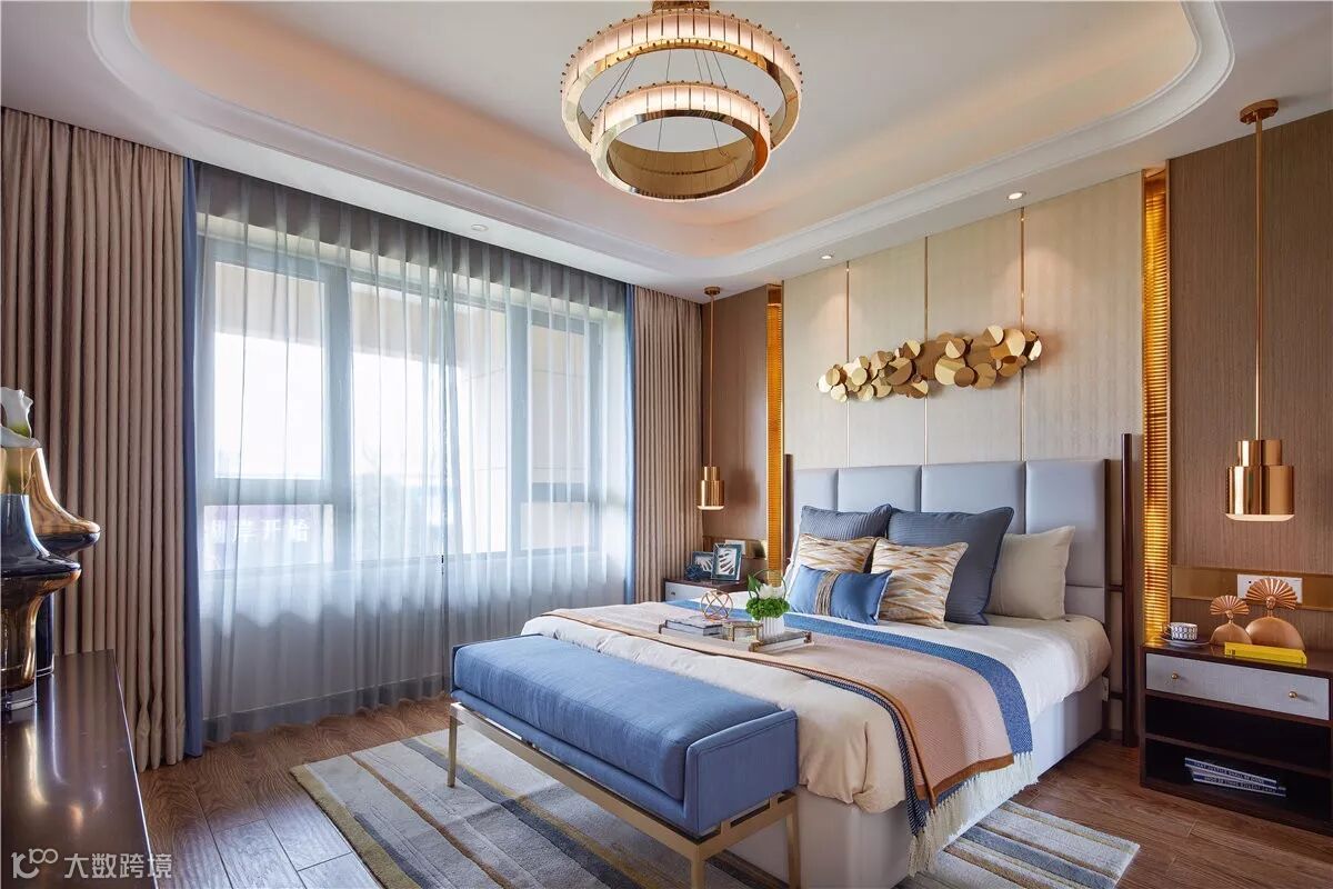 二层主卧摒弃繁杂的设计,强调质感及舒适性。在背景立面的细节处加入金属装点,使简约舒适的卧室不失精致。