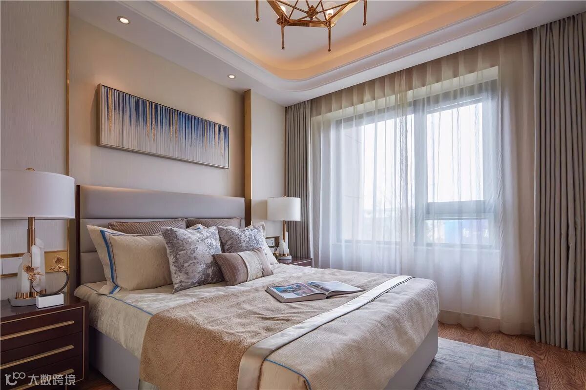 长辈房为营造静谧、安逸的氛围,在立面及床品均采用淡雅的浅大地色,散发着温柔的质感,一幅富有节奏感的蓝、金色挂画,平衡了空间的动与静。